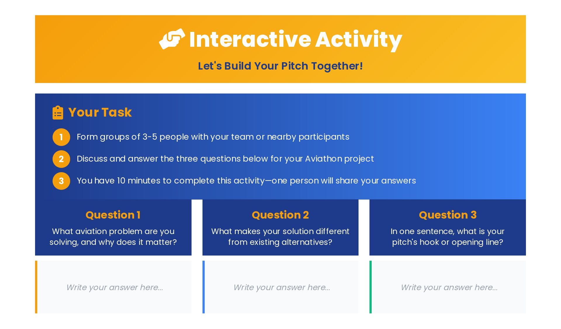 Task 1 Form groups of 3-5 people with your team or nearby participants 2 Discuss and answer the three questions below for your Aviathon project 3 You have 10 minutes to complete this activity—one person will share your answers Question 1 What aviation problem are you solving, and why does it matter? Write your answer here... Question 2 What makes your solution different from existing alternatives? Write your answer here... Question 3 In one sentence, what is your pitch's hook or opening line? Write your answer here...
