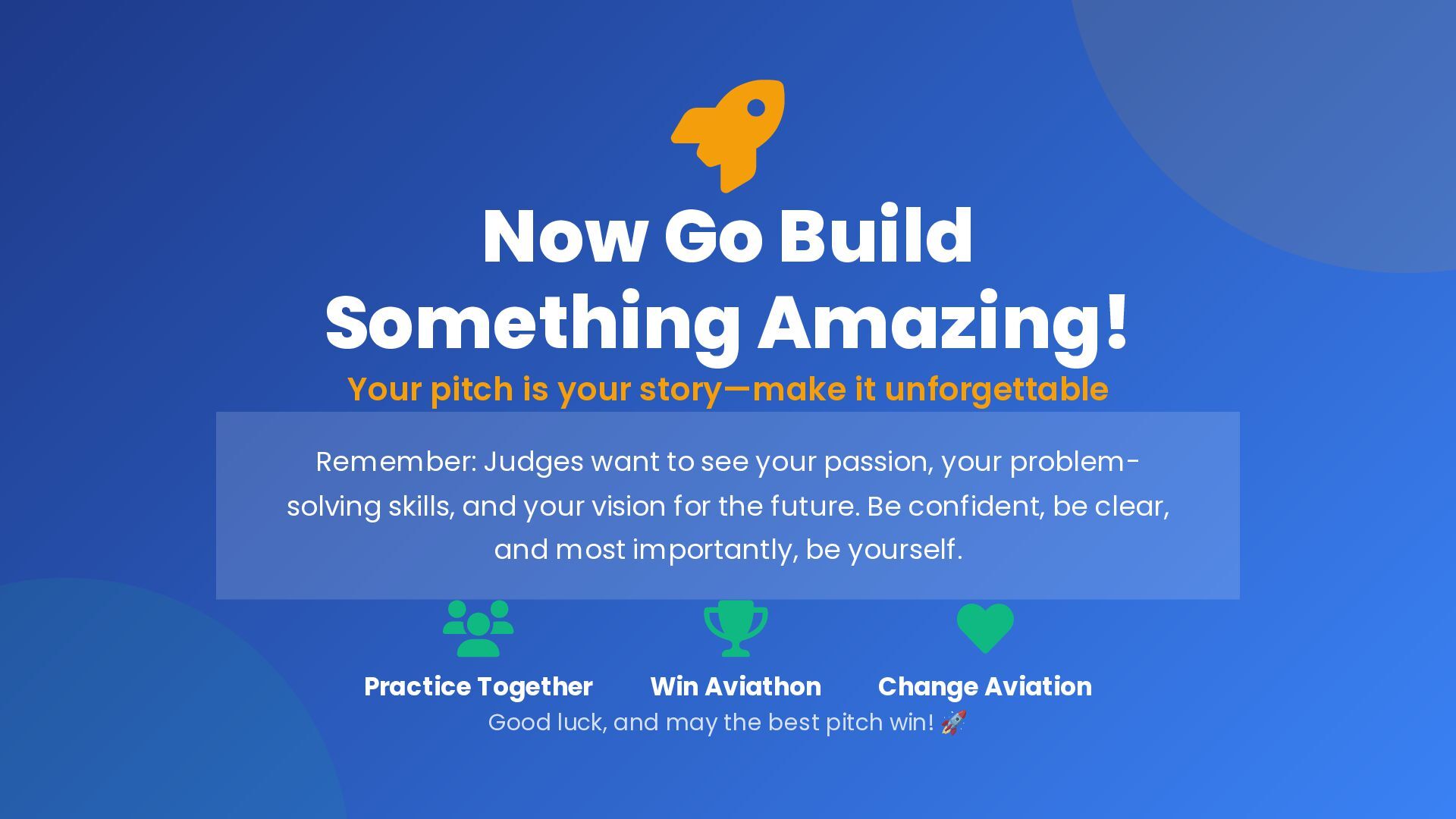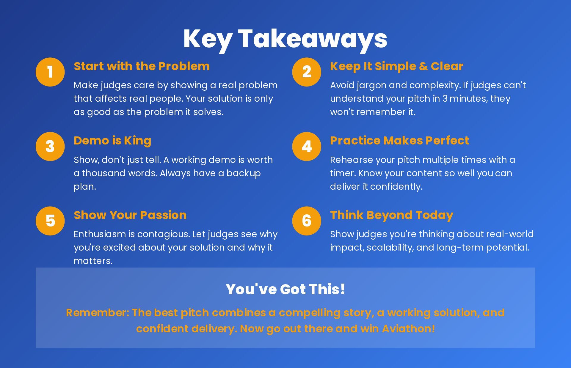 by showing a real problem that affects real people. Your solution is only as good as the problem it solves. 2 Keep It Simple & Clear Avoid jargon and complexity. If judges can't understand your pitch in 3 minutes, they won't remember it. 3 Demo is King Show, don't just tell. A working demo is worth a thousand words. Always have a backup plan. 4 Practice Makes Perfect Rehearse your pitch multiple times with a timer. Know your content so well you can deliver it confidently. 5 Show Your Passion Enthusiasm is contagious. Let judges see why you're excited about your solution and why it matters. 6 Think Beyond Today Show judges you're thinking about real-world impact, scalability, and long-term potential. You've Got This! Remember: The best pitch combines a compelling story, a working solution, and confident delivery. Now go out there and win Aviathon!