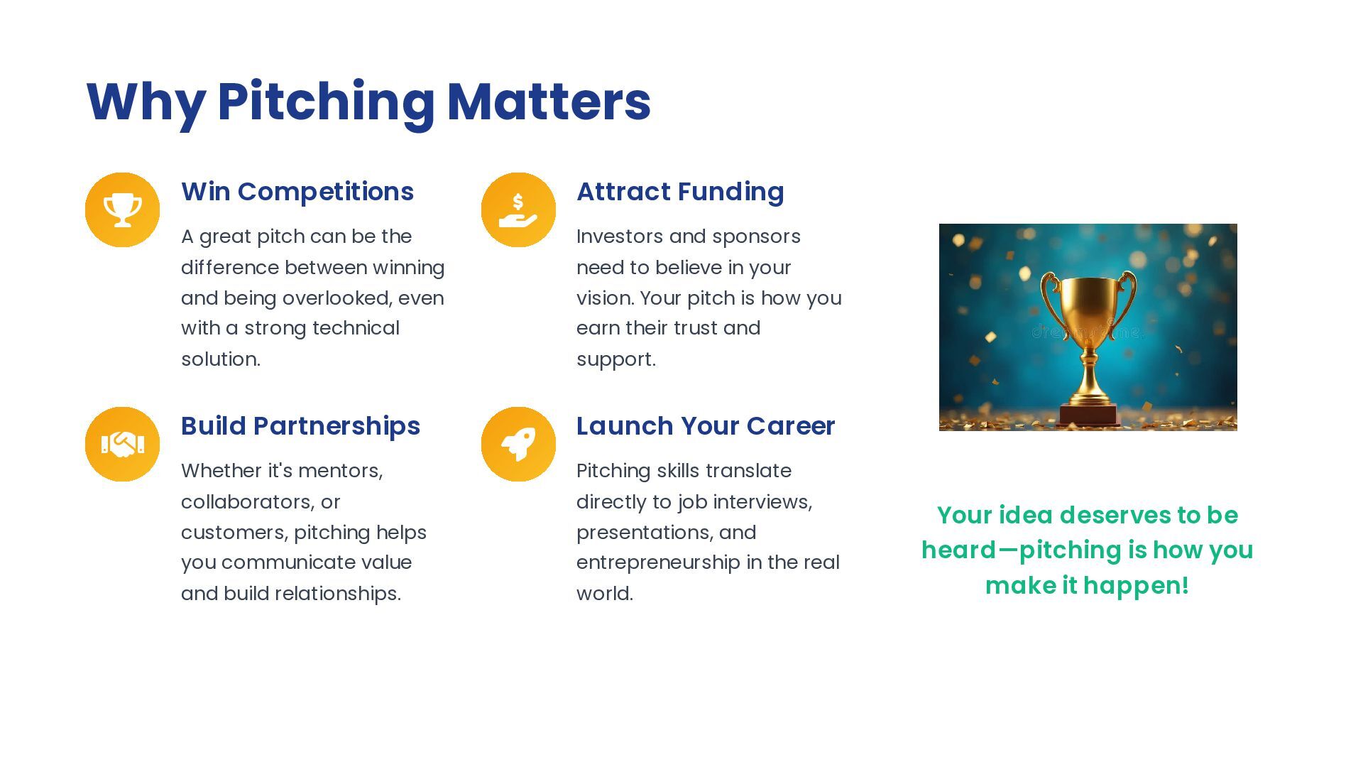 be the difference between winning and being overlooked, even with a strong technical solution. Attract Funding Investors and sponsors need to believe in your vision. Your pitch is how you earn their trust and support. Build Partnerships Whether it's mentors, collaborators, or customers, pitching helps you communicate value and build relationships. Launch Your Career Pitching skills translate directly to job interviews, presentations, and entrepreneurship in the real world. Your idea deserves to be heard—pitching is how you make it happen!
