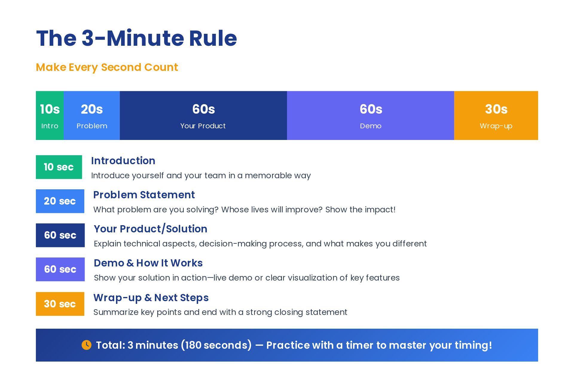 Introduce yourself and your team in a memorable way 20 sec Problem Statement What problem are you solving? Whose lives will improve? Show the impact! 60 sec Your Product/Solution Explain technical aspects, decision-making process, and what makes you different 60 sec Demo & How It Works Show your solution in action—live demo or clear visualization of key features 30 sec Wrap-up & Next Steps Summarize key points and end with a strong closing statement Total: 3 minutes (180 seconds) — Practice with a timer to master your timing! 10s Intro 20s Problem 60s Your Product 60s Demo 30s Wrap-up