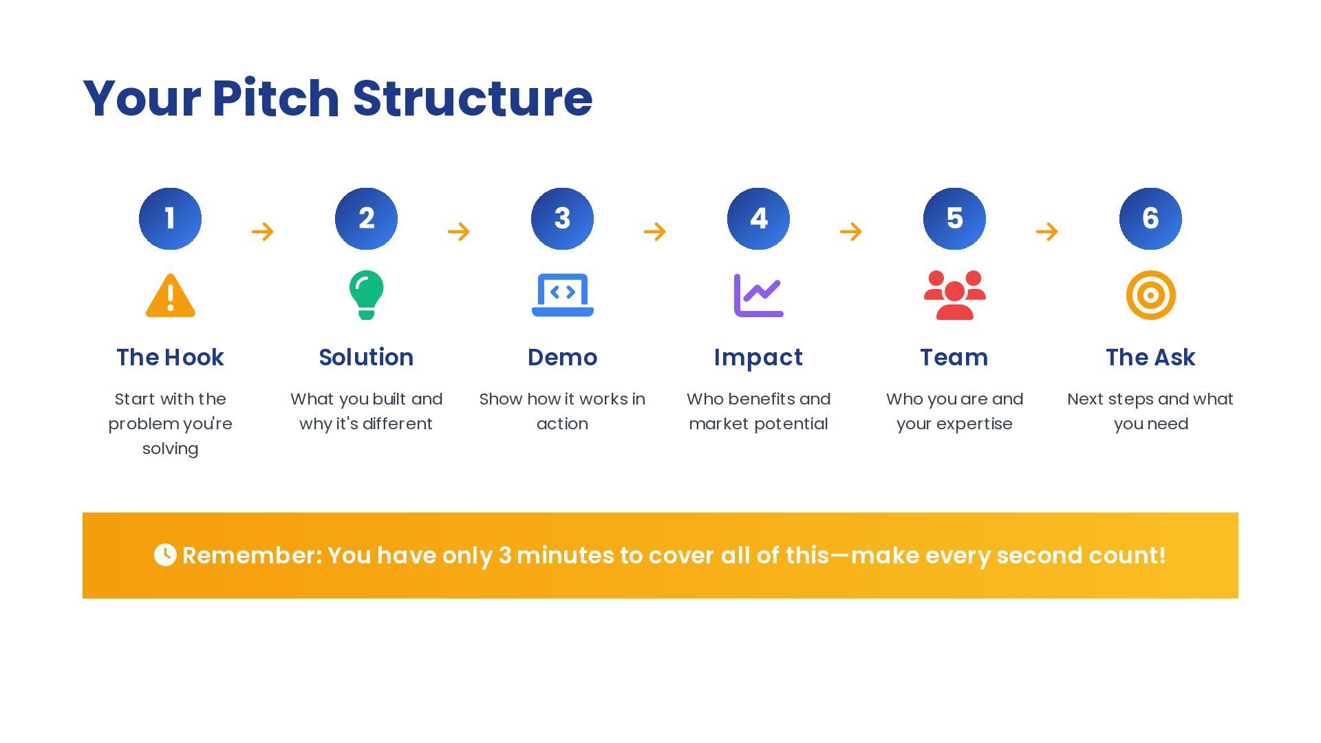 to cover all of this—make every second count! 1 The Hook Start with the problem you're solving 2 Solution What you built and why it's different 3 Demo Show how it works in action 4 Impact Who benefits and market potential 5 Team Who you are and your expertise 6 The Ask Next steps and what you need