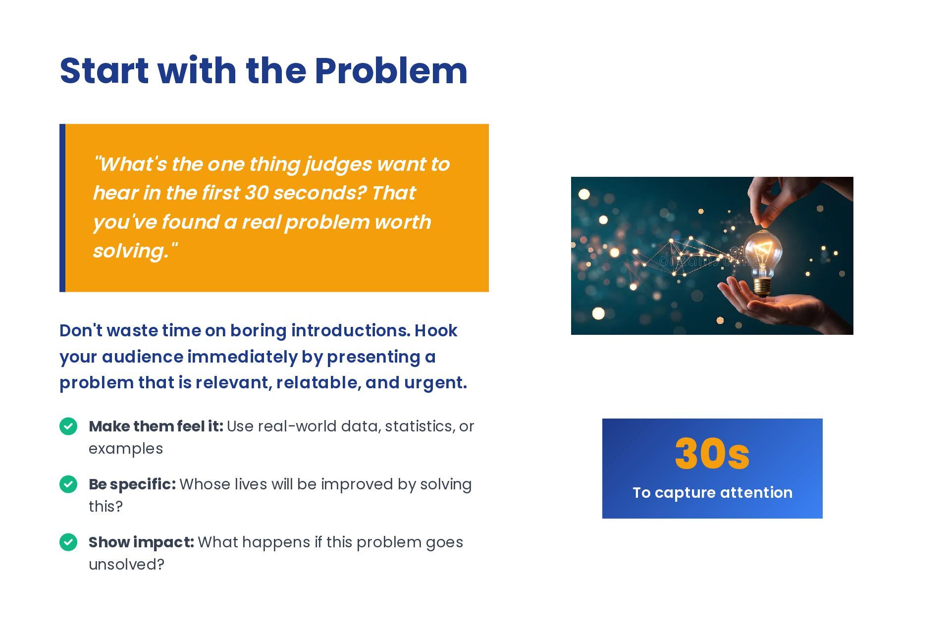 to hear in the first 30 seconds? That you've found a real problem worth solving." Don't waste time on boring introductions. Hook your audience immediately by presenting a problem that is relevant, relatable, and urgent. Make them feel it: Use real-world data, statistics, or examples Be specific: Whose lives will be improved by solving this? Show impact: What happens if this problem goes unsolved? 30s To capture attention