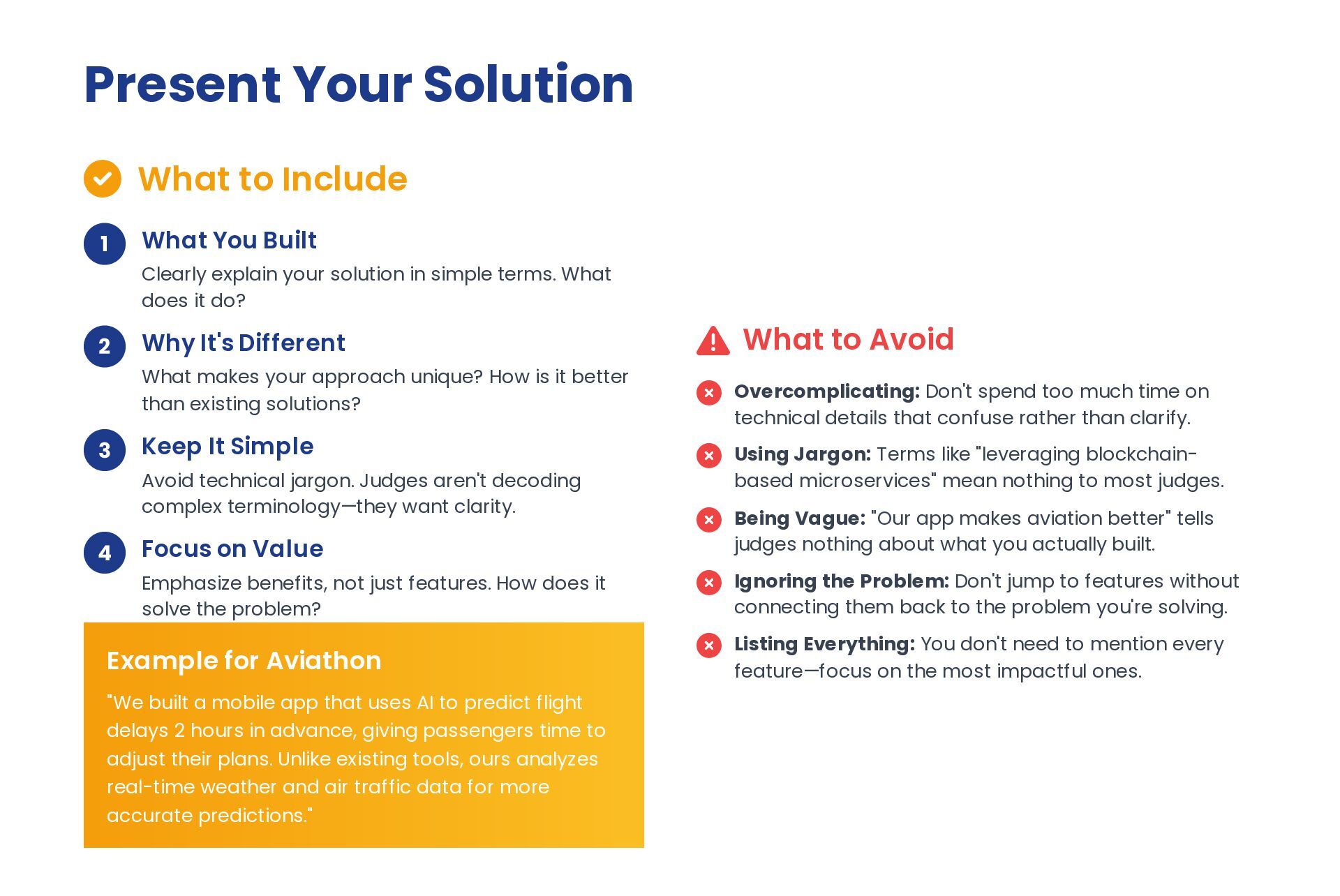 Built Clearly explain your solution in simple terms. What does it do? 2 Why It's Different What makes your approach unique? How is it better than existing solutions? 3 Keep It Simple Avoid technical jargon. Judges aren't decoding complex terminology—they want clarity. 4 Focus on Value Emphasize benefits, not just features. How does it solve the problem? Example for Aviathon "We built a mobile app that uses AI to predict flight delays 2 hours in advance, giving passengers time to adjust their plans. Unlike existing tools, ours analyzes real-time weather and air traffic data for more accurate predictions." What to Avoid Overcomplicating: Don't spend too much time on technical details that confuse rather than clarify. Using Jargon: Terms like "leveraging blockchain- based microservices" mean nothing to most judges. Being Vague: "Our app makes aviation better" tells judges nothing about what you actually built. Ignoring the Problem: Don't jump to features without connecting them back to the problem you're solving. Listing Everything: You don't need to mention every feature—focus on the most impactful ones.