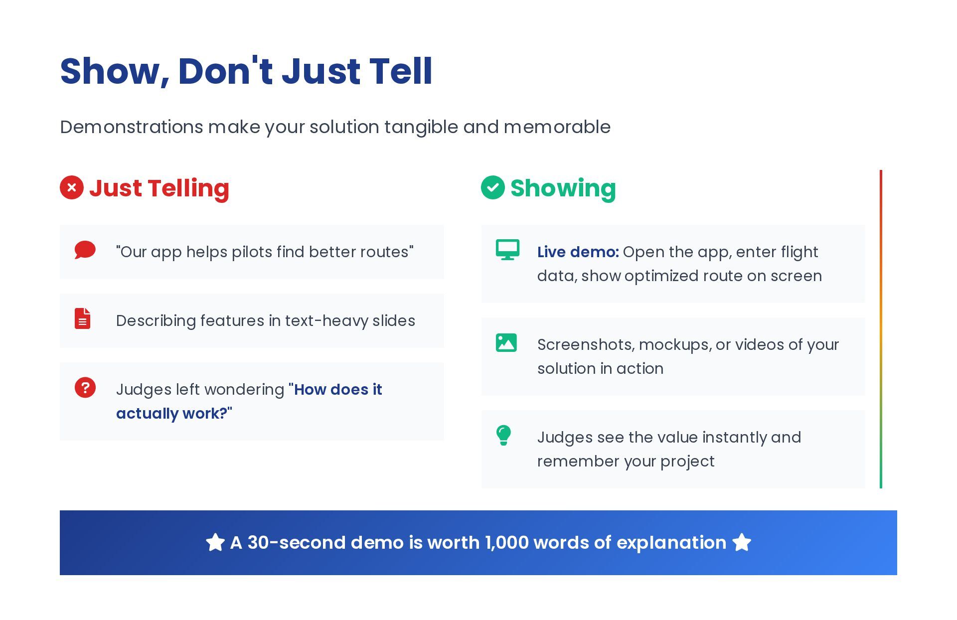 memorable Just Telling "Our app helps pilots find better routes" Describing features in text-heavy slides Judges left wondering "How does it actually work?" Showing Live demo: Open the app, enter flight data, show optimized route on screen Screenshots, mockups, or videos of your solution in action Judges see the value instantly and remember your project A 30-second demo is worth 1,000 words of explanation