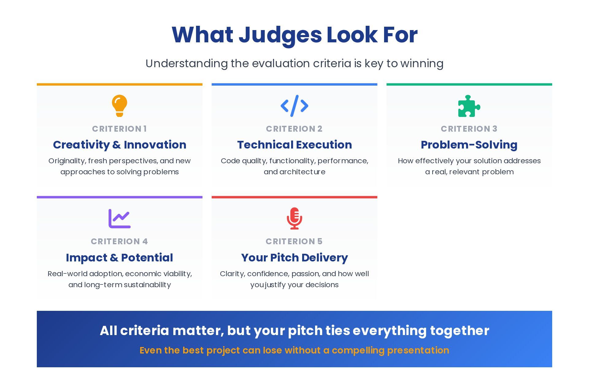 to winning CRITERION 1 Creativity & Innovation Originality, fresh perspectives, and new approaches to solving problems CRITERION 2 Technical Execution Code quality, functionality, performance, and architecture CRITERION 3 Problem-Solving How effectively your solution addresses a real, relevant problem CRITERION 4 Impact & Potential Real-world adoption, economic viability, and long-term sustainability CRITERION 5 Your Pitch Delivery Clarity, confidence, passion, and how well you justify your decisions All criteria matter, but your pitch ties everything together Even the best project can lose without a compelling presentation