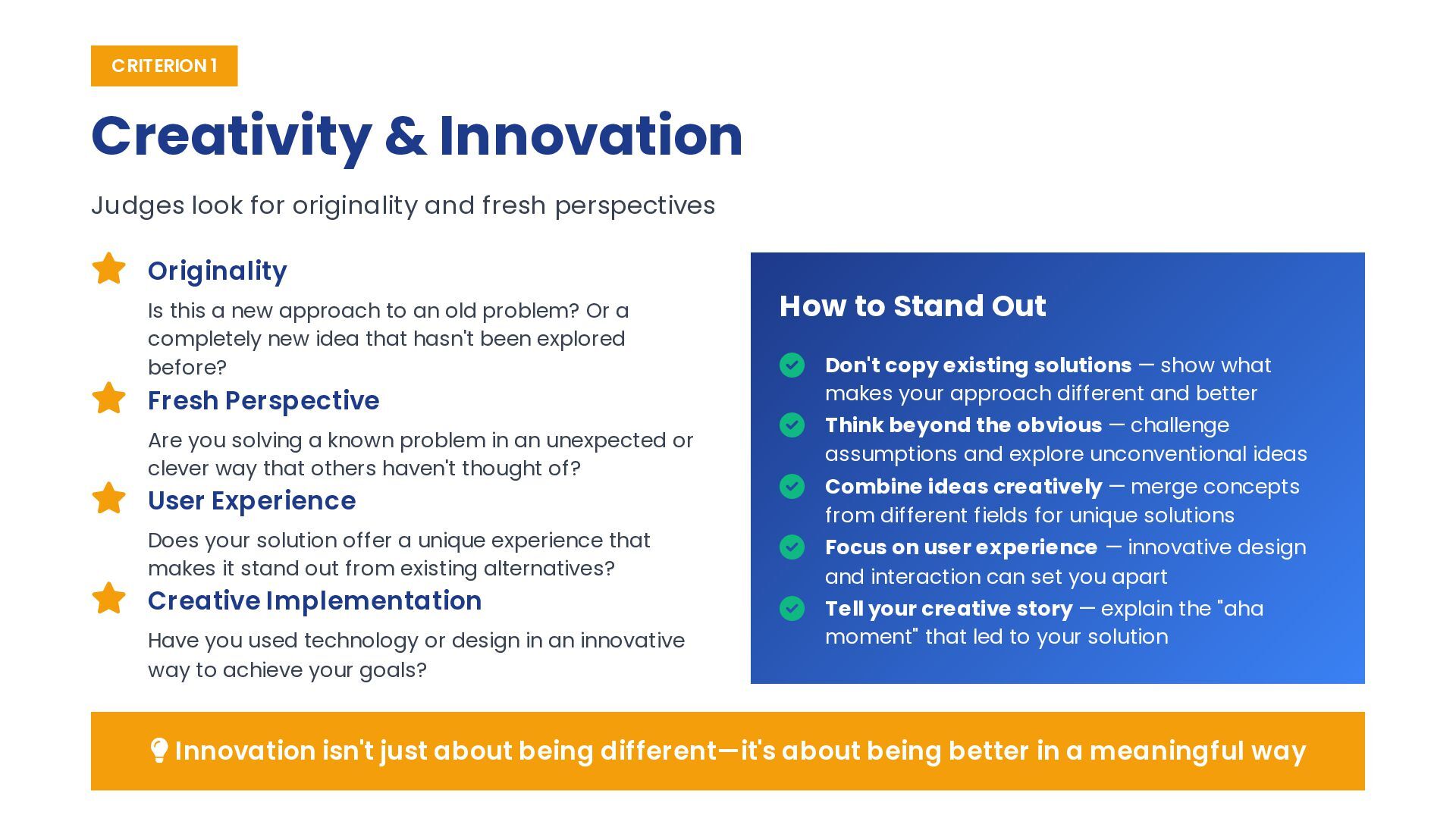 fresh perspectives Originality Is this a new approach to an old problem? Or a completely new idea that hasn't been explored before? Fresh Perspective Are you solving a known problem in an unexpected or clever way that others haven't thought of? User Experience Does your solution offer a unique experience that makes it stand out from existing alternatives? Creative Implementation Have you used technology or design in an innovative way to achieve your goals? How to Stand Out Don't copy existing solutions — show what makes your approach different and better Think beyond the obvious — challenge assumptions and explore unconventional ideas Combine ideas creatively — merge concepts from different fields for unique solutions Focus on user experience — innovative design and interaction can set you apart Tell your creative story — explain the "aha moment" that led to your solution Innovation isn't just about being different—it's about being better in a meaningful way