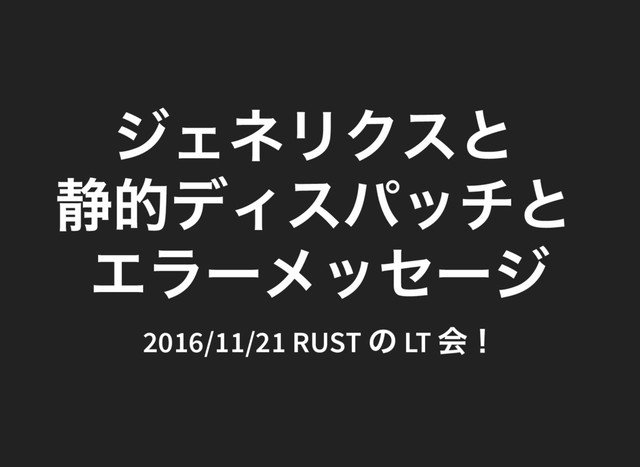 Greet for String { fn greet(&self) -> String { format!("Hello, I'm {}", self) } } impl Greet for i64 { fn greet(&self) -> String { format!("Hello, I'm No.{}", self) } } ジェネリクスにトレイトによる制約がつけられる fn conversation<T: Greet, U: Greet>(t: T, u: U) { println!("T => {}", t.greet()); println!("U => {}", u.greet()); } monomorphization によってコンパイルされる の部分はどうなる?