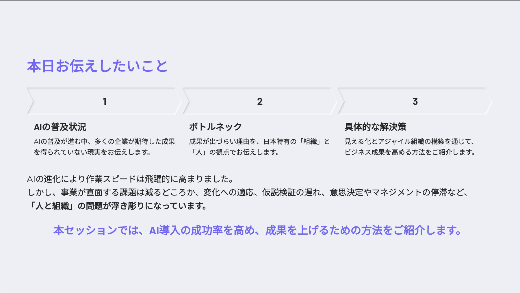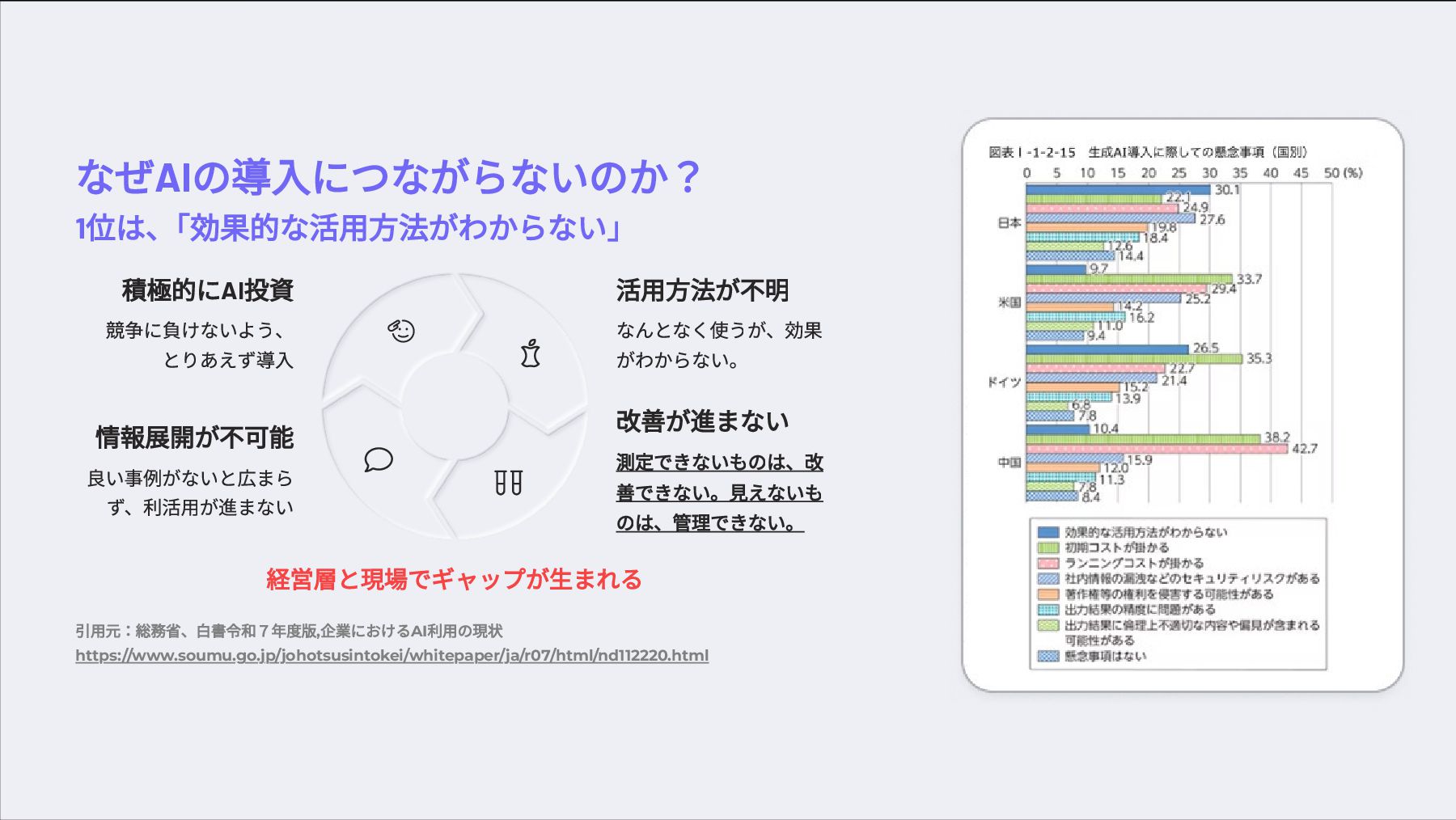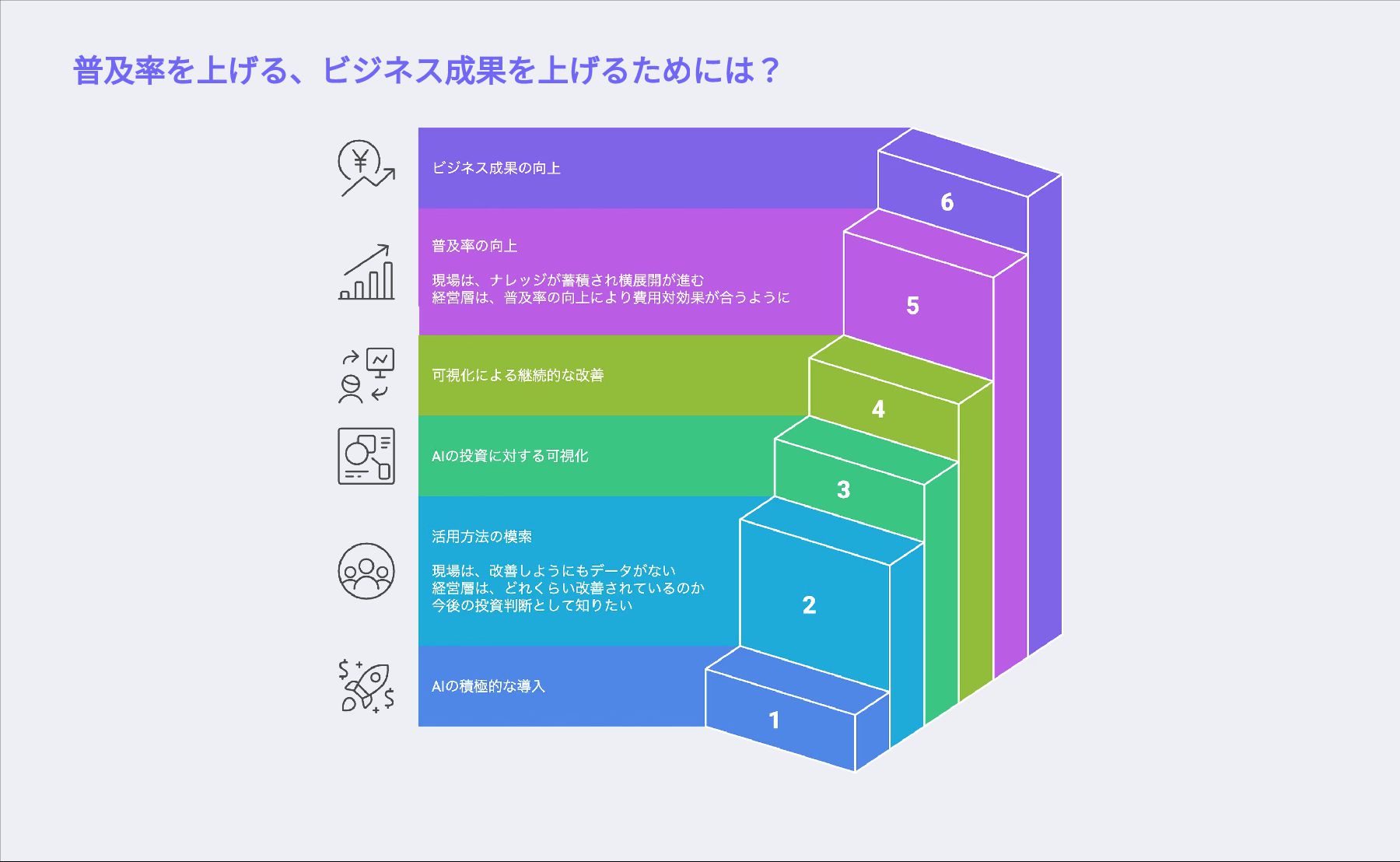 という3つのキーワードを軸に、AIの効果を最大化するための具体的な打ち手を紹介します。