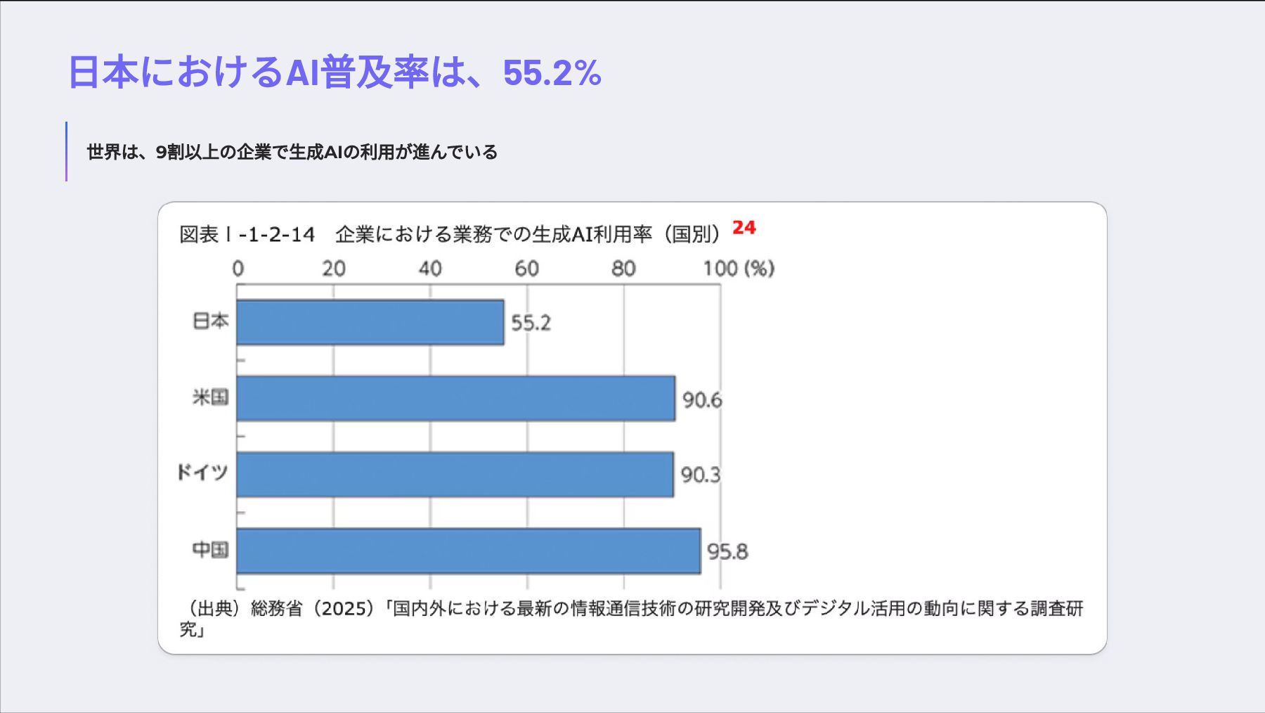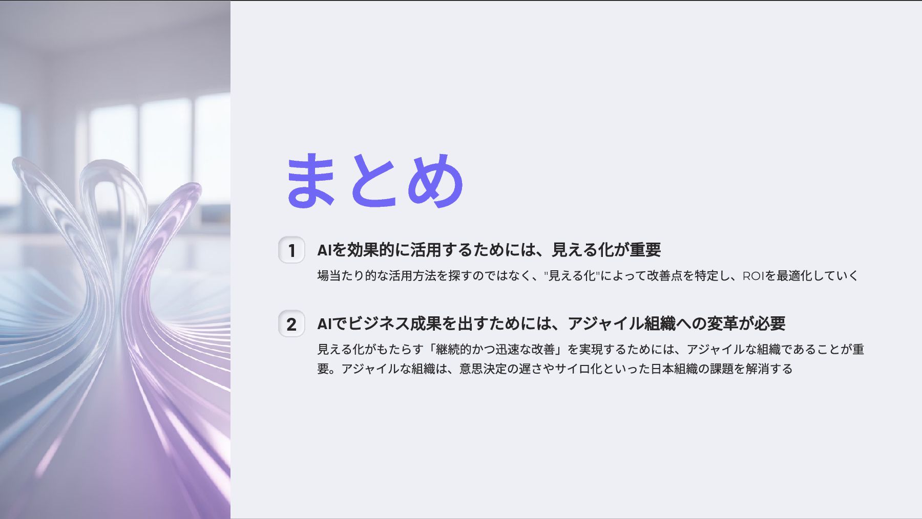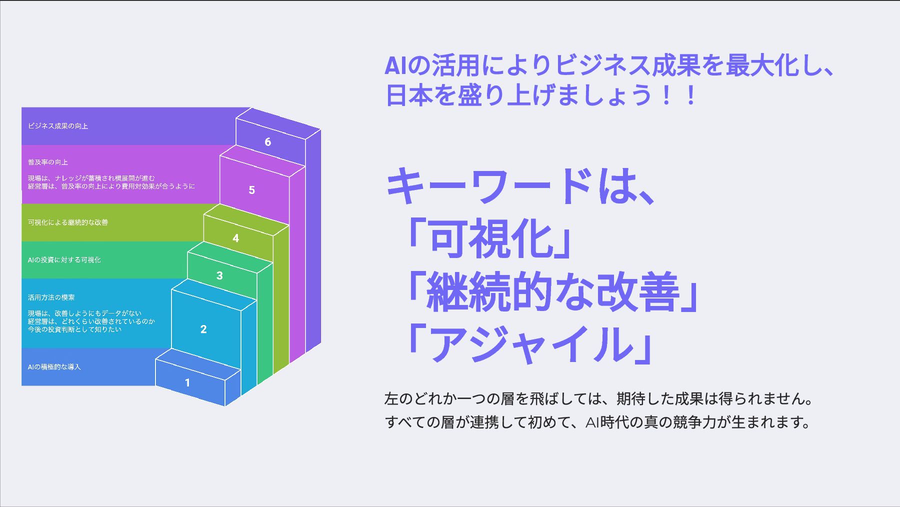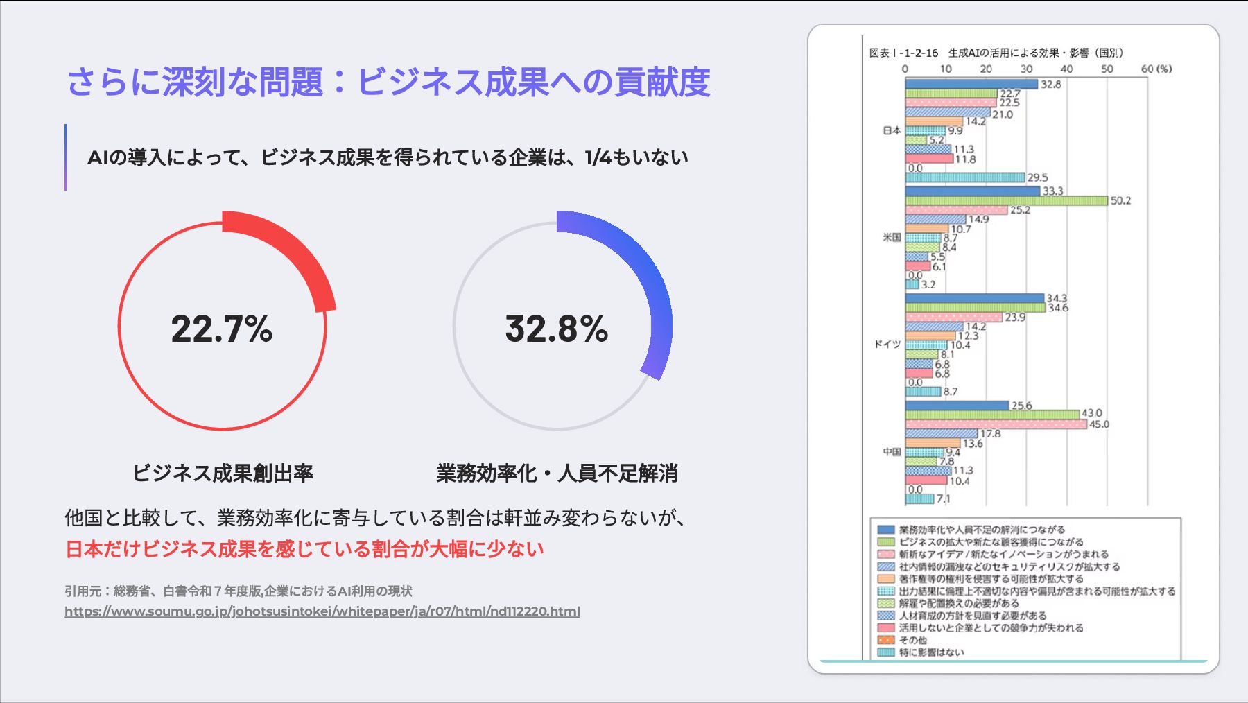 という3つのキーワードを軸に、AIの効果を最大化するための具体的な打ち手を紹介します。