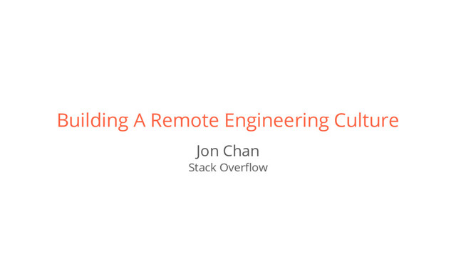 the future of talent. There are so many different advantages to having a remote team. 2. How we do it At Stack Overflow, remote is part of our DNA. Here are the different things we’ve done to make remote possible. 3. Extreme remote I’ve personally taken our remote policy to an extreme. I’ll give you a look into what it’s like to be nomadic while working full time as an engineer at Stack Overflow. 4. Questions Ask me anything. Also, I would love to keep in touch and answer any questions you may have in the future. I’ll let you know what the best way to get in touch is. @jonhmchan