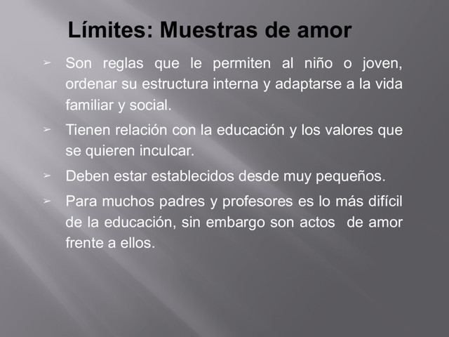 ordenar su estructura interna y adaptarse a la vida familiar y social. ➢ Tienen relación con la educación y los valores que se quieren inculcar. ➢ Deben estar establecidos desde muy pequeños. ➢ Para muchos padres y profesores es lo más difícil de la educación, sin embargo son actos de amor frente a ellos. Límites: Muestras de amor