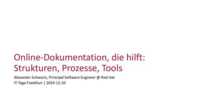 Als Werkzeuge kommen AsciiDoc, Antora und weitere Werkzeuge aus dem Docs-as-Code Ökosystem zum Einsatz. Als Beispiel dienen verschiedene Open-Source-Projekte, und es werden öffentlich verfügbare Online-Ressourcen zum Thema vorgestellt.