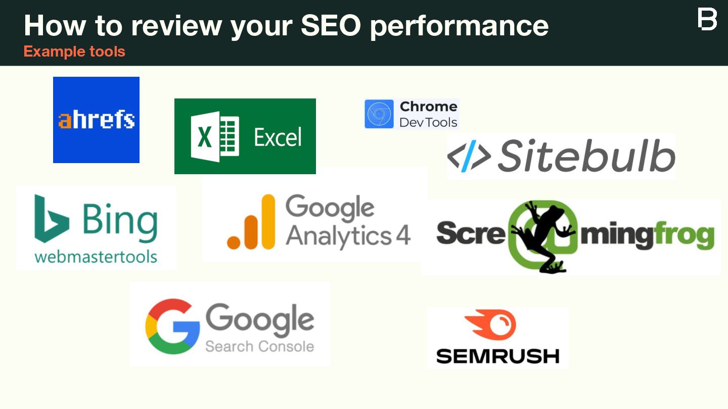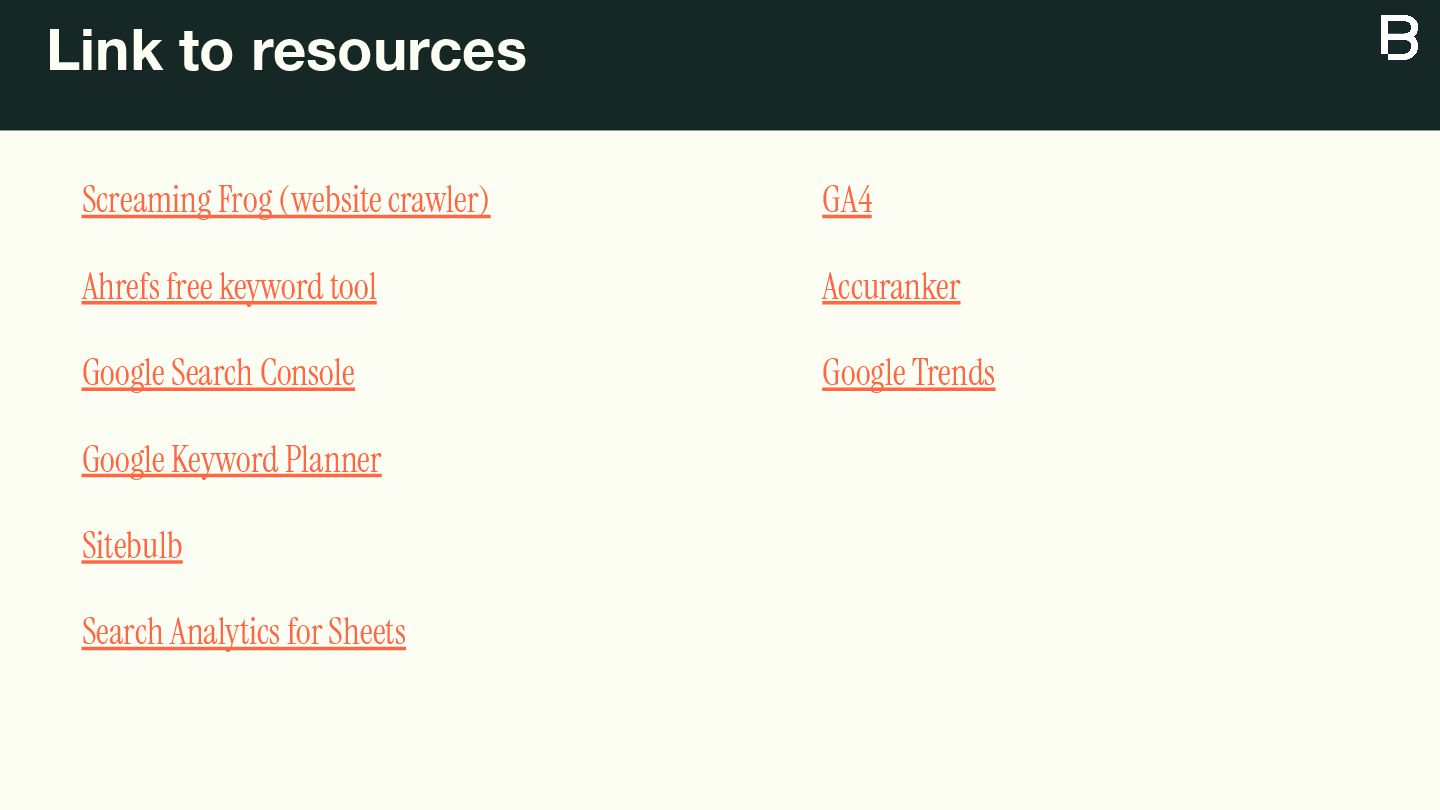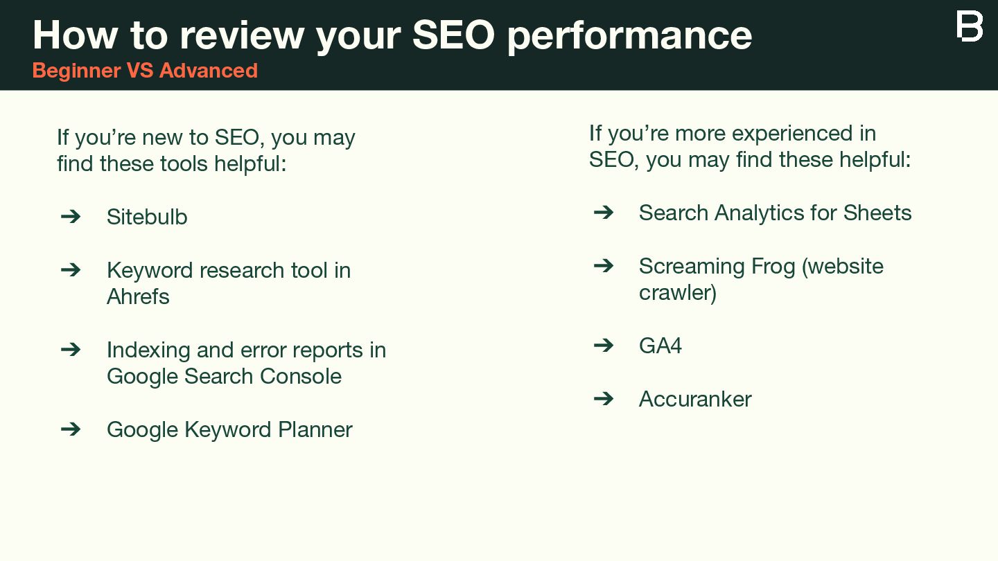 you’re new to SEO, you may find these tools helpful: ➔ Sitebulb ➔ Keyword research tool in Ahrefs ➔ Indexing and error reports in Google Search Console ➔ Google Keyword Planner If you’re more experienced in SEO, you may find these helpful: ➔ Search Analytics for Sheets ➔ Screaming Frog (website crawler) ➔ GA4 ➔ Accuranker