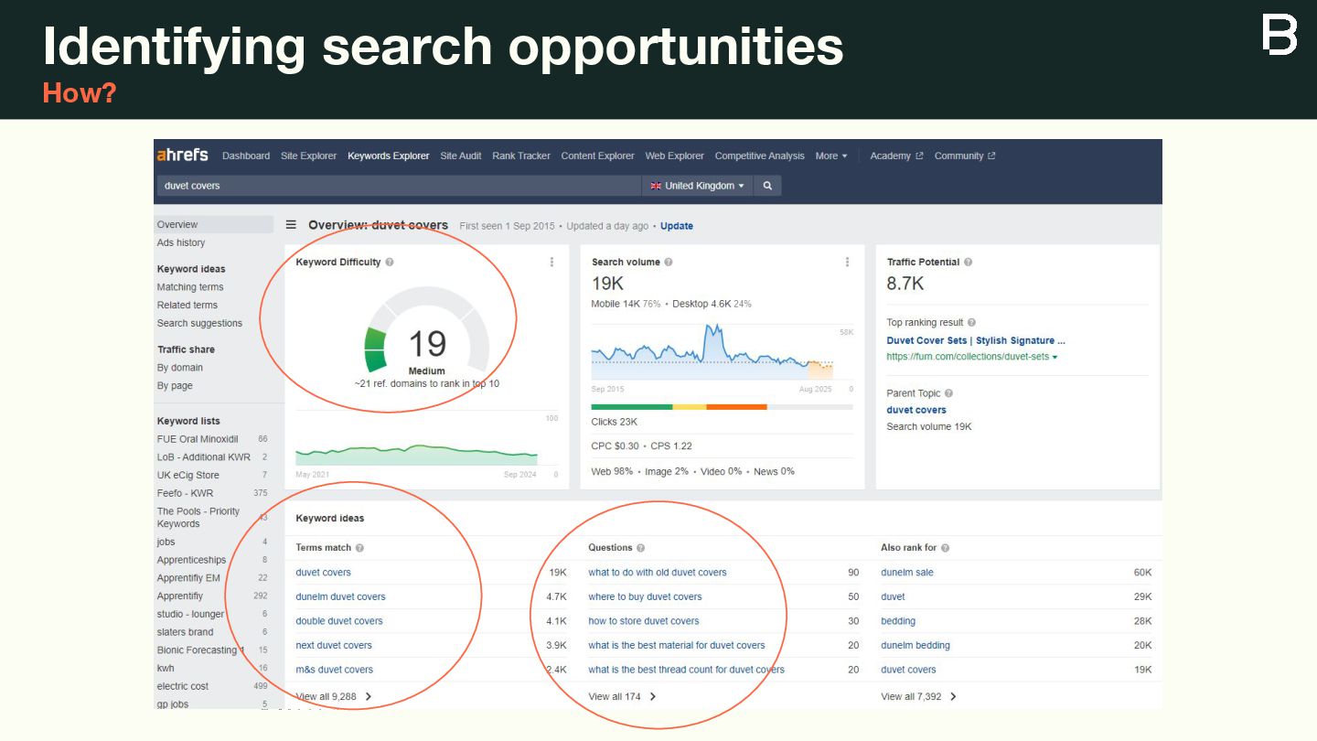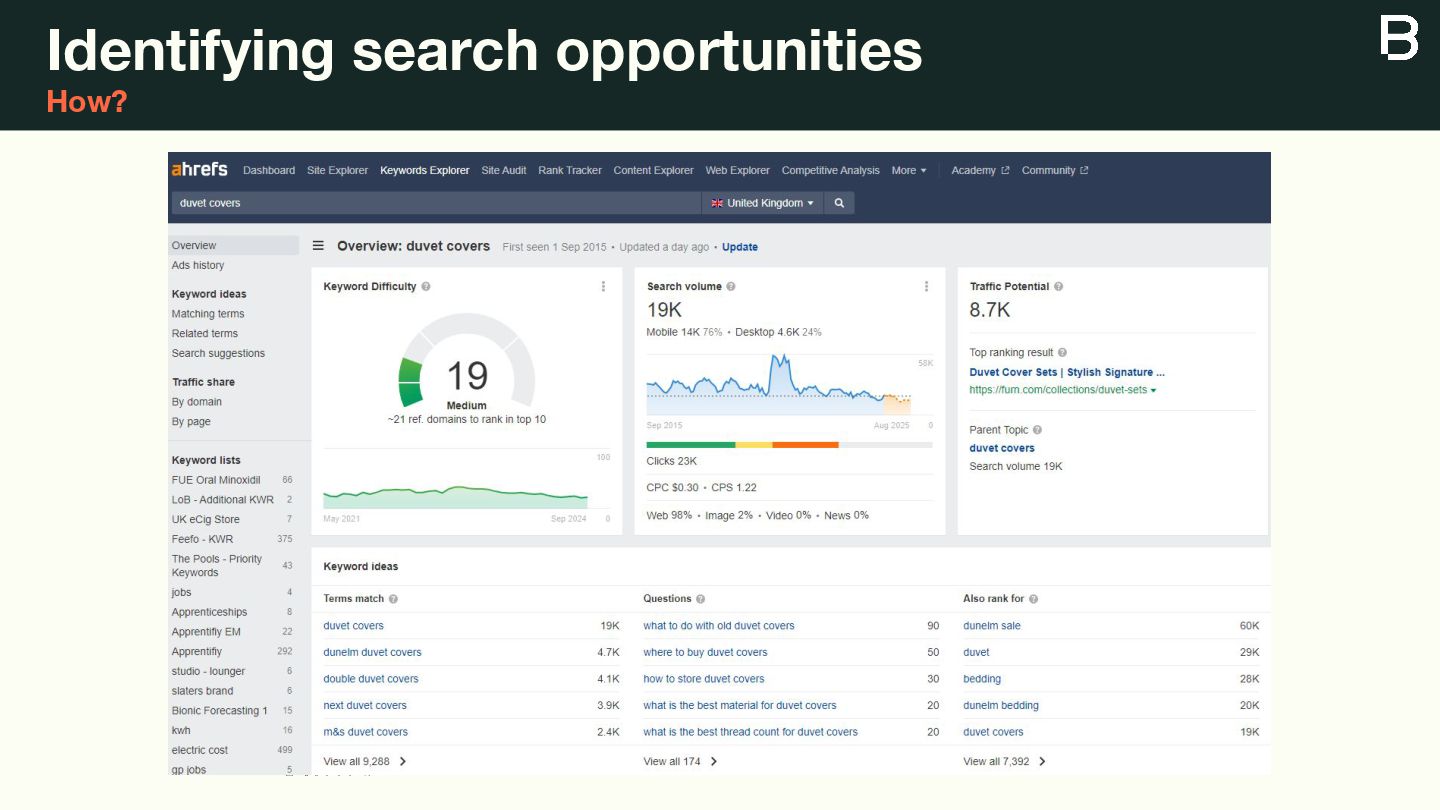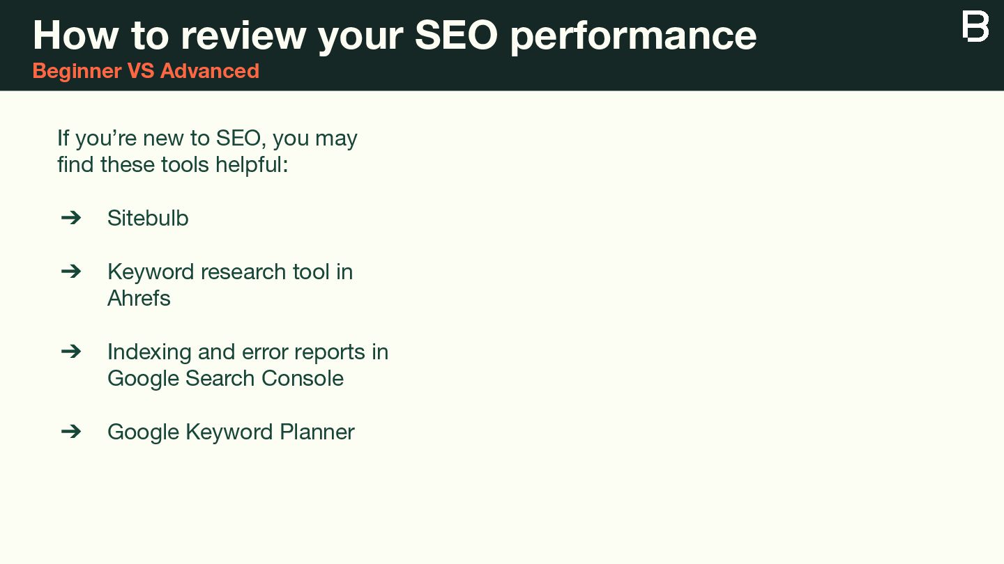 you’re new to SEO, you may find these tools helpful: ➔ Sitebulb ➔ Keyword research tool in Ahrefs ➔ Indexing and error reports in Google Search Console ➔ Google Keyword Planner