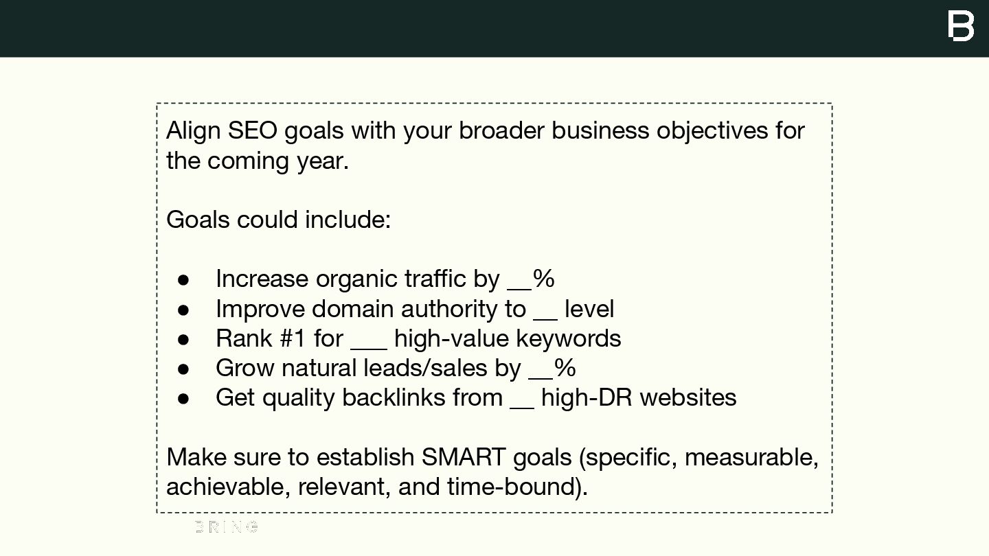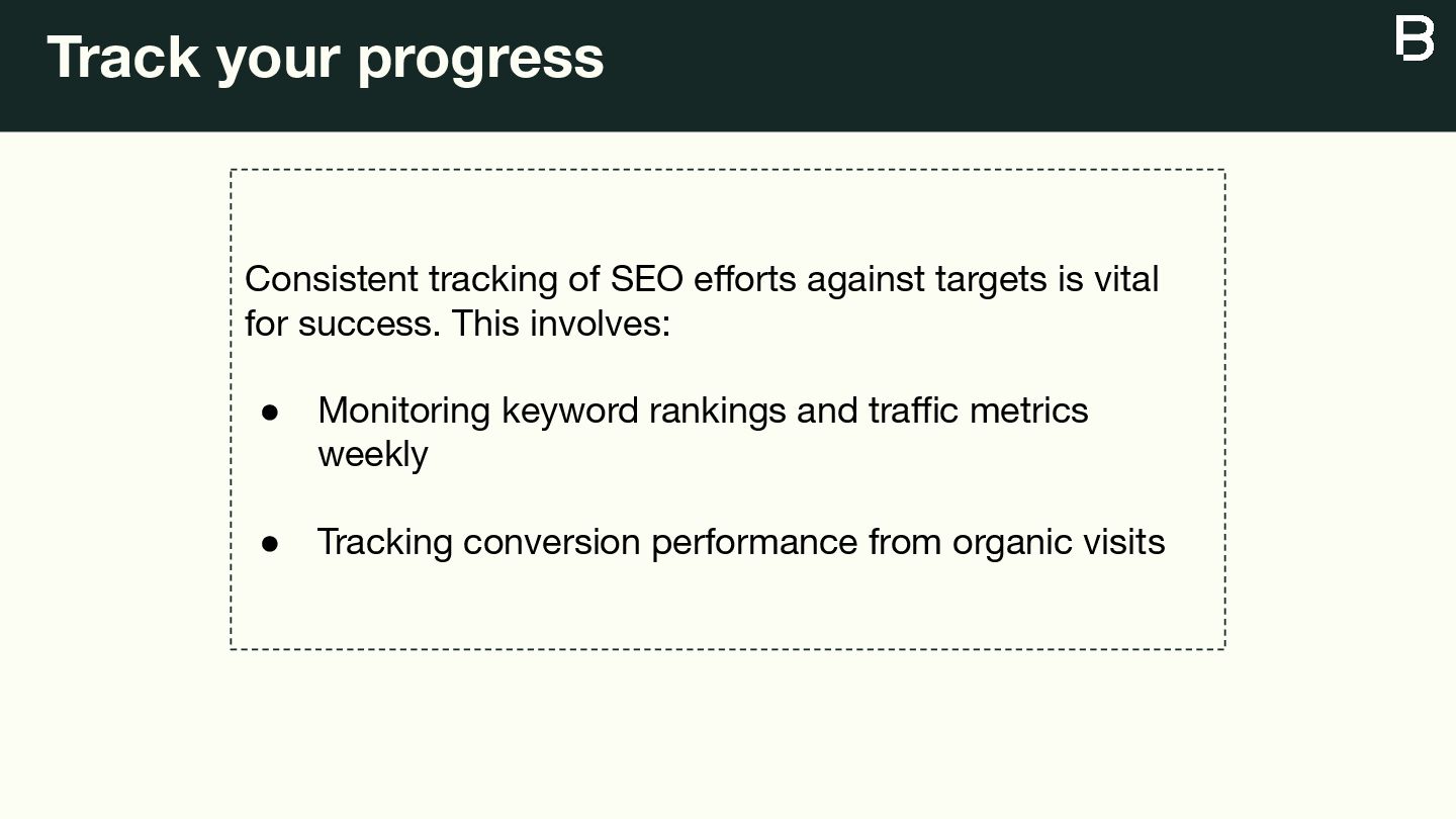 include 1. Analyse your current SEO performance through audits (technical, on-page, link profile, rankings & visibility) 2. Define your priorities and goals