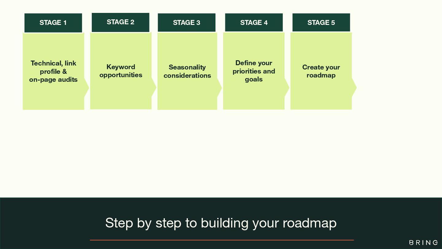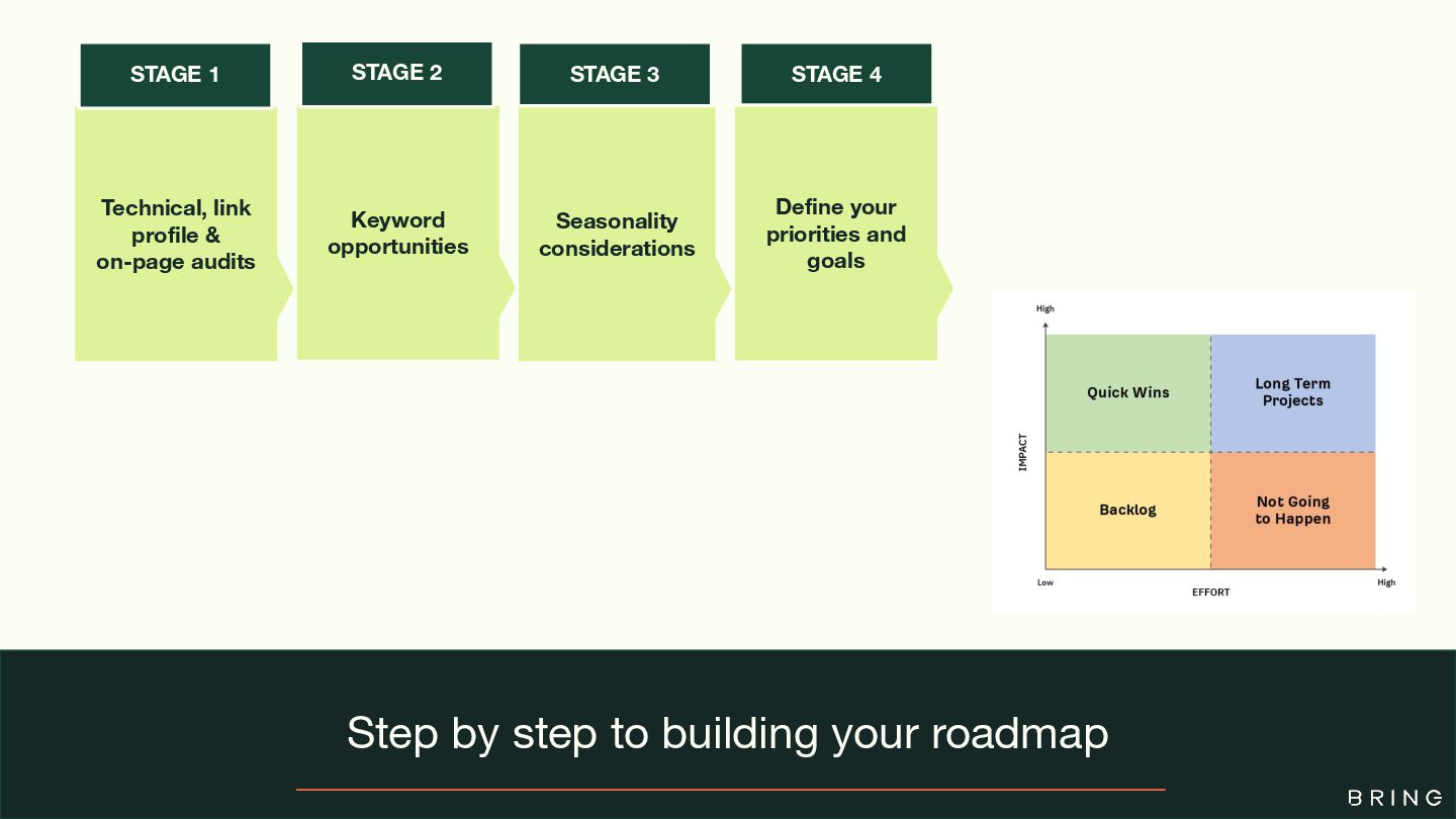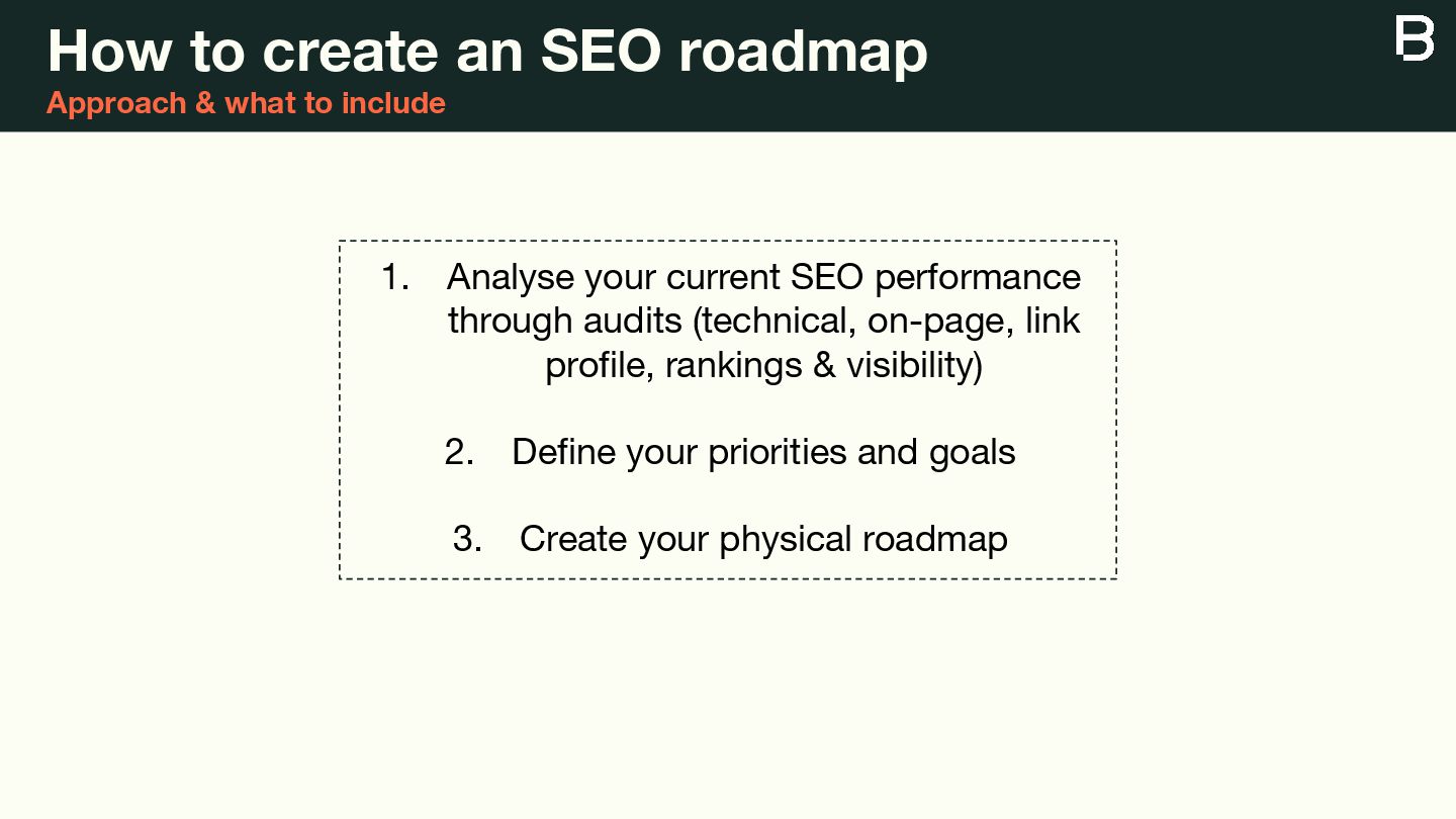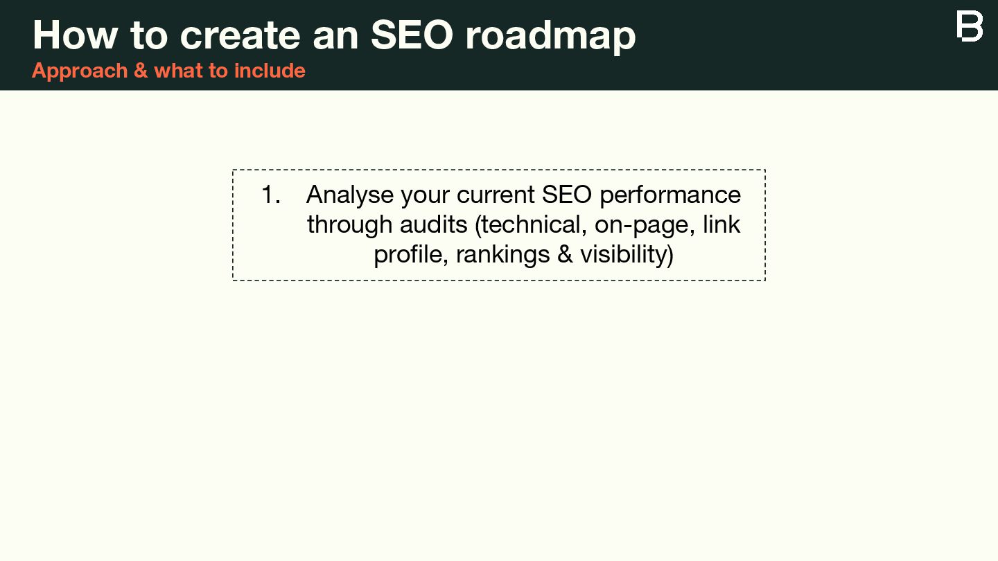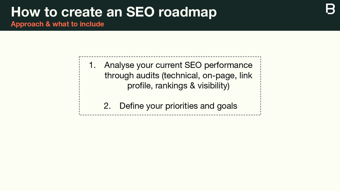 include 1. Analyse your current SEO performance through audits (technical, on-page, link profile, rankings & visibility) 2. Define your priorities and goals 3. Create your physical roadmap
