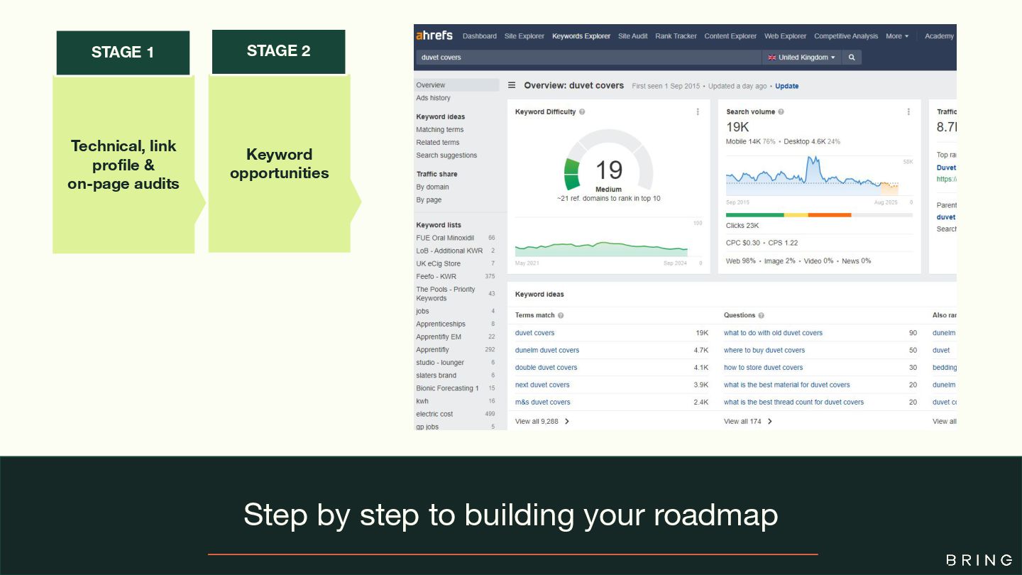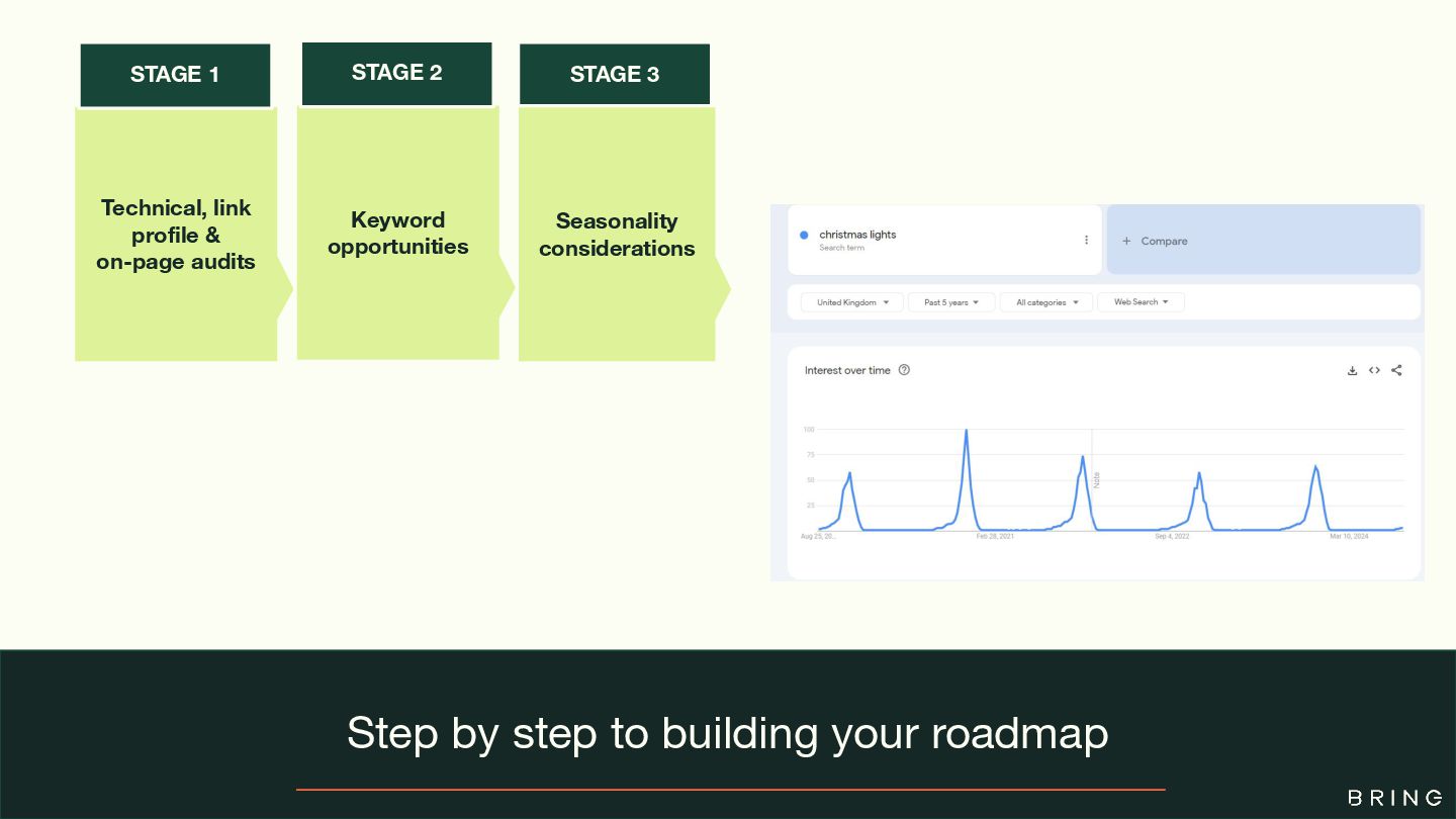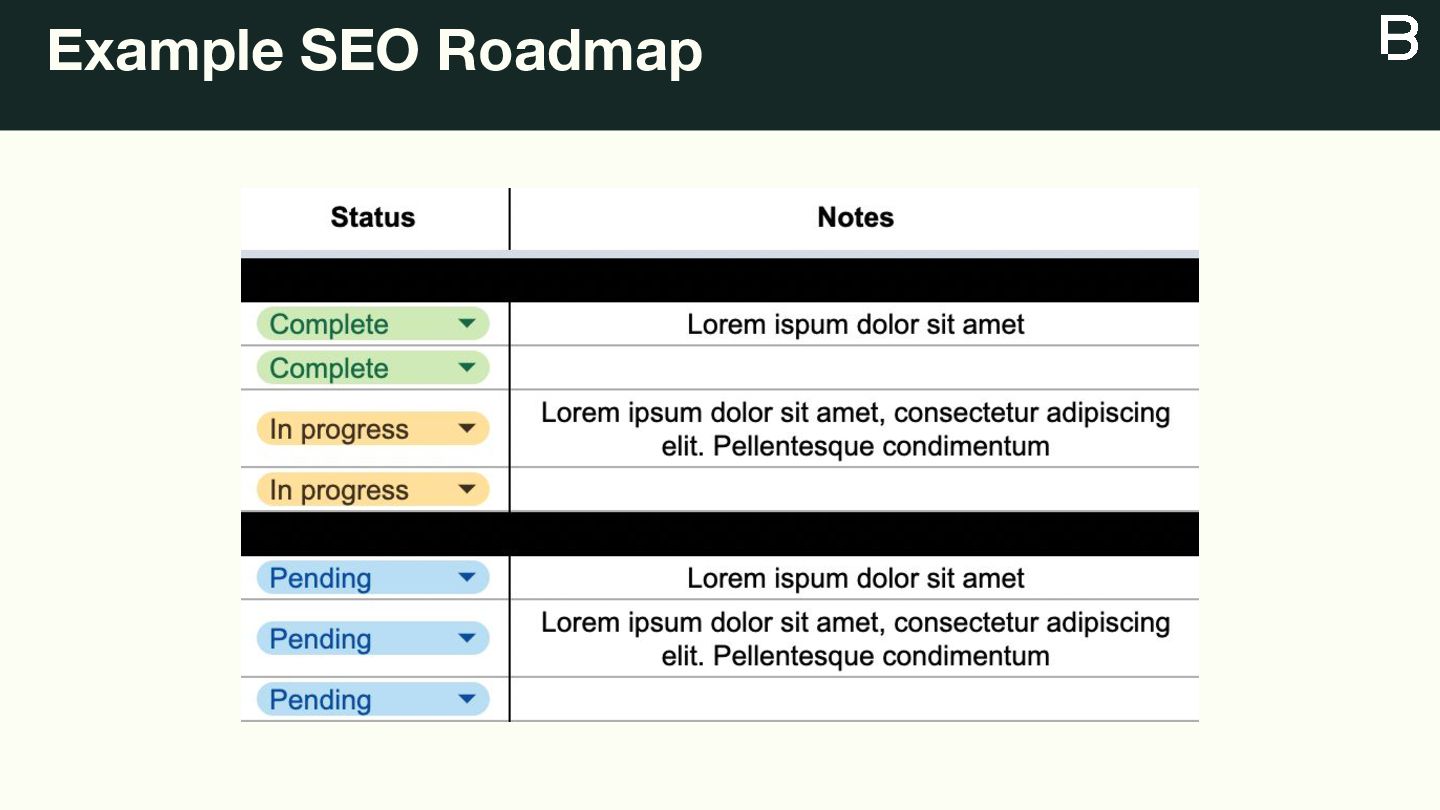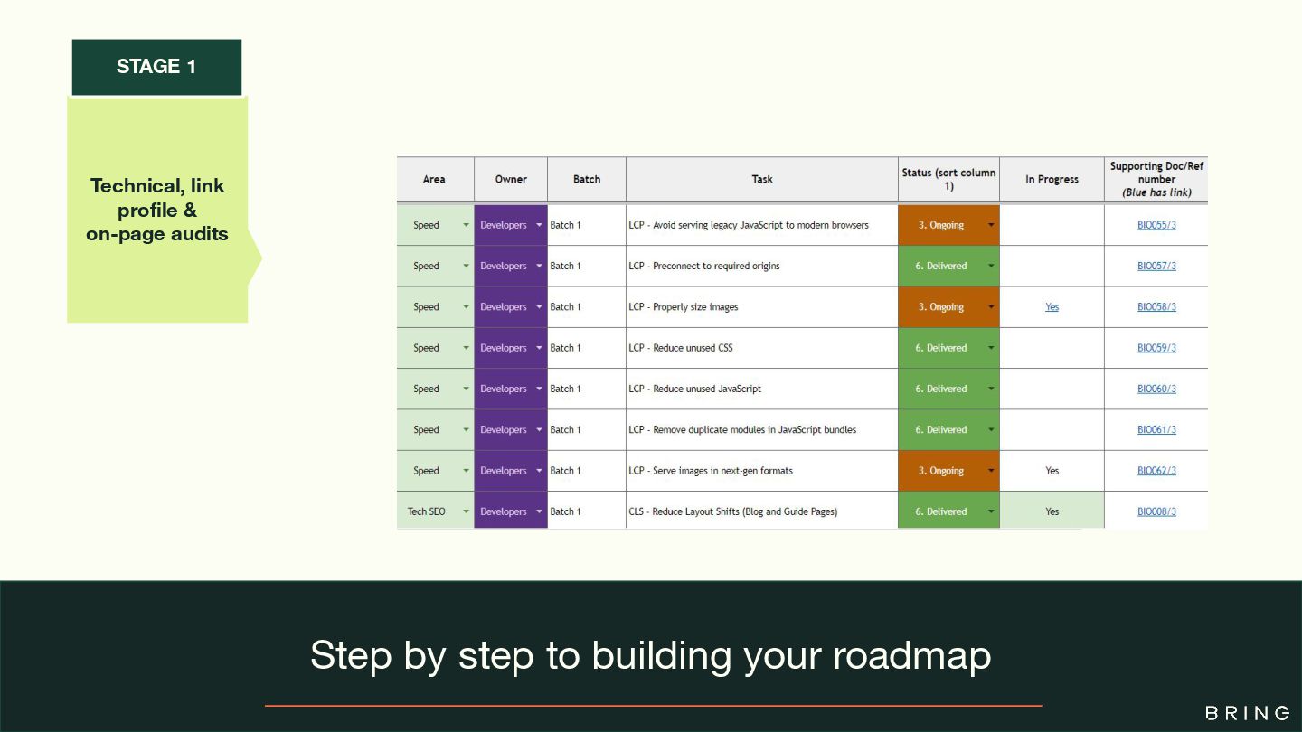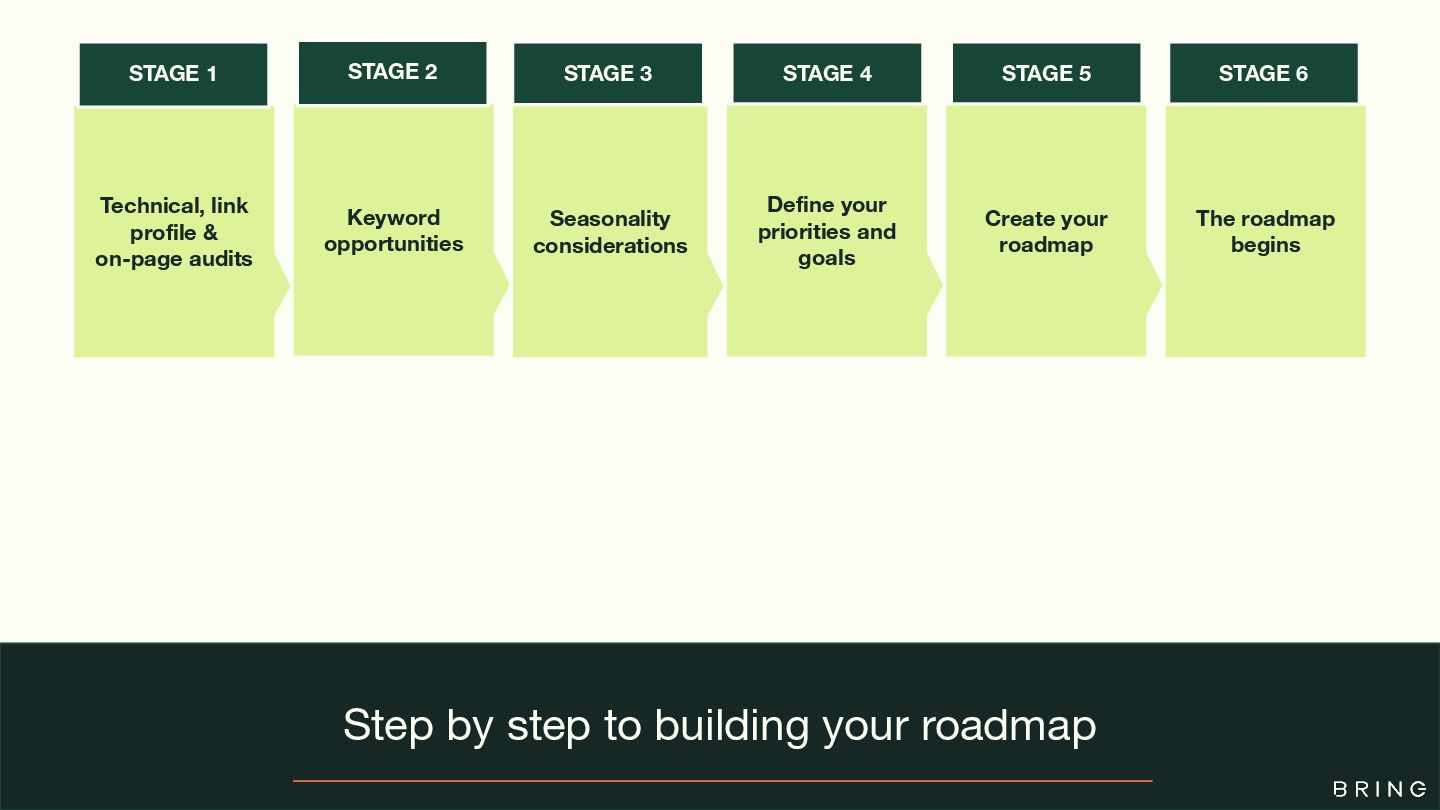 include 1. Analyse your current SEO performance through audits (technical, on-page, link profile, rankings & visibility) 2. Define your priorities and goals 3. Create your physical roadmap
