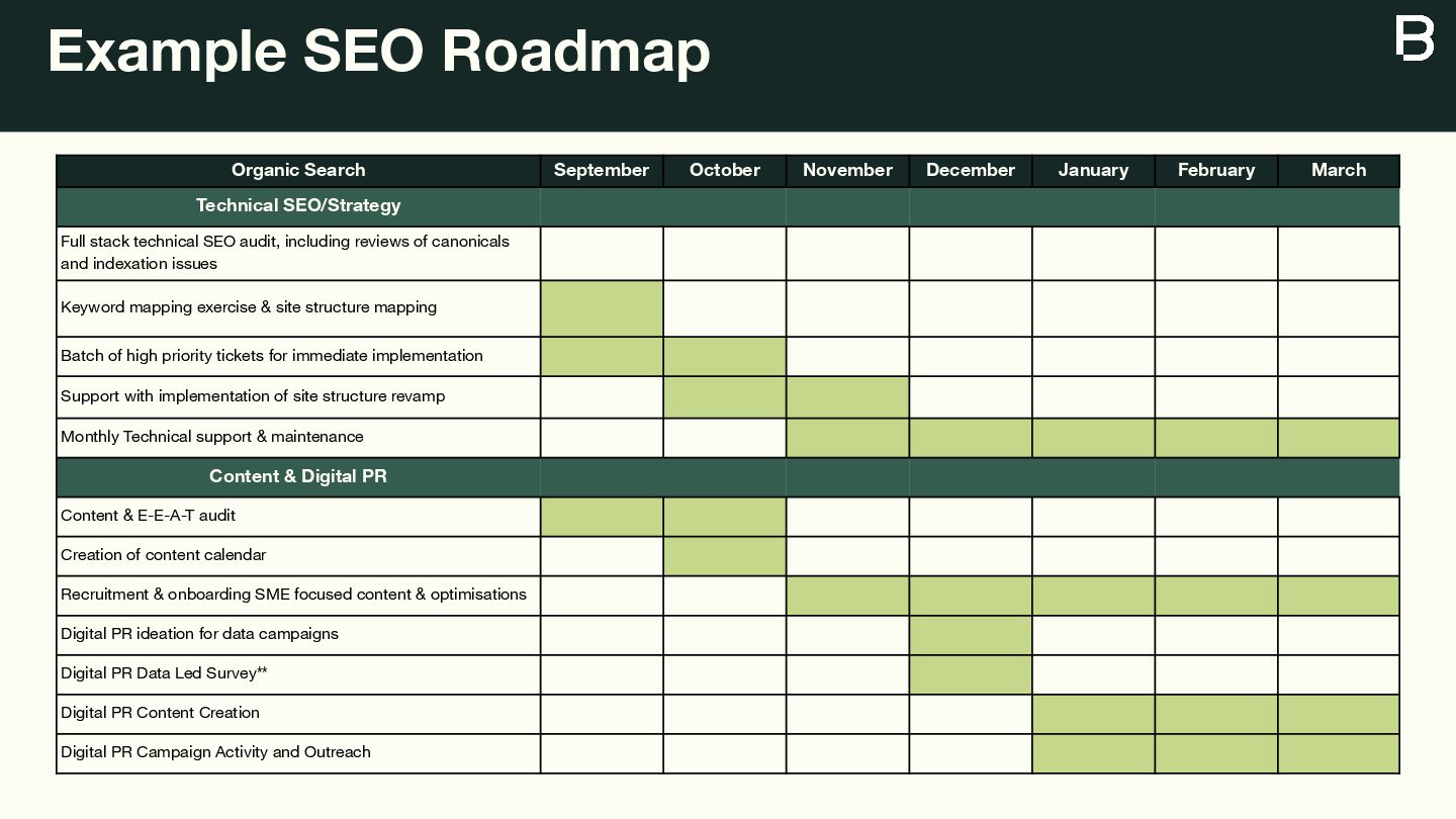 February March Technical SEO/Strategy Full stack technical SEO audit, including reviews of canonicals and indexation issues Keyword mapping exercise & site structure mapping Batch of high priority tickets for immediate implementation Support with implementation of site structure revamp Monthly Technical support & maintenance Content & Digital PR Content & E-E-A-T audit Creation of content calendar Recruitment & onboarding SME focused content & optimisations Digital PR ideation for data campaigns Digital PR Data Led Survey** Digital PR Content Creation Digital PR Campaign Activity and Outreach