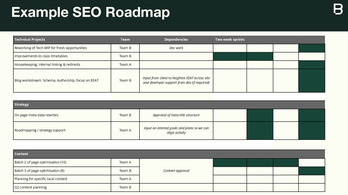Reworking of Tech WIP for fresh opportunities Team B Dev work Improvements to class timetables Team B Housekeeping, internal linking & redirects Team A Blog workstream: Schema, Authorship, focus on EEAT Team B Input from client to heighten EEAT across site and developer support from dev (if required) Strategy On page meta data rewrites Team B Approval of meta title structure Roadmapping / strategy support Team A Input on internal goals and plans so we can align activity Content Batch 2 of page optimisation (10) Team A Content approval Batch 3 of page optimisation (8) Team B Planning for specific local content Team A Q2 content planning Team B