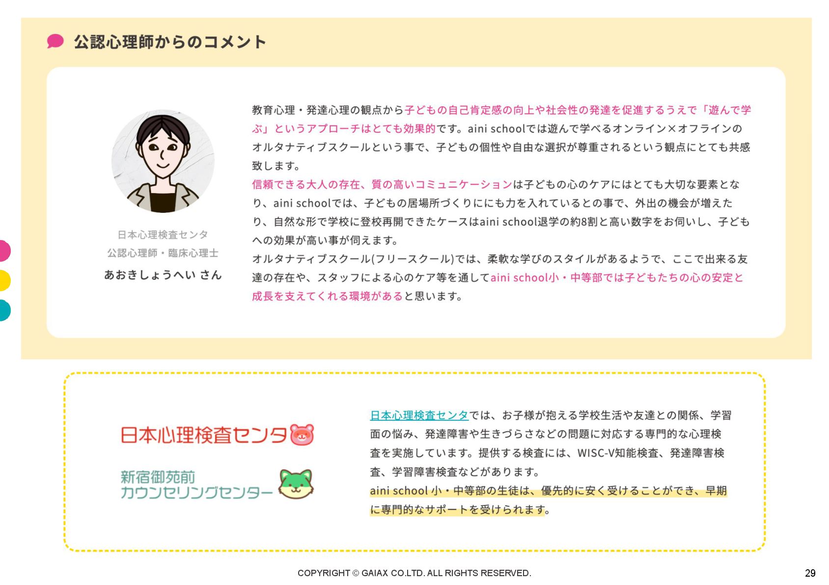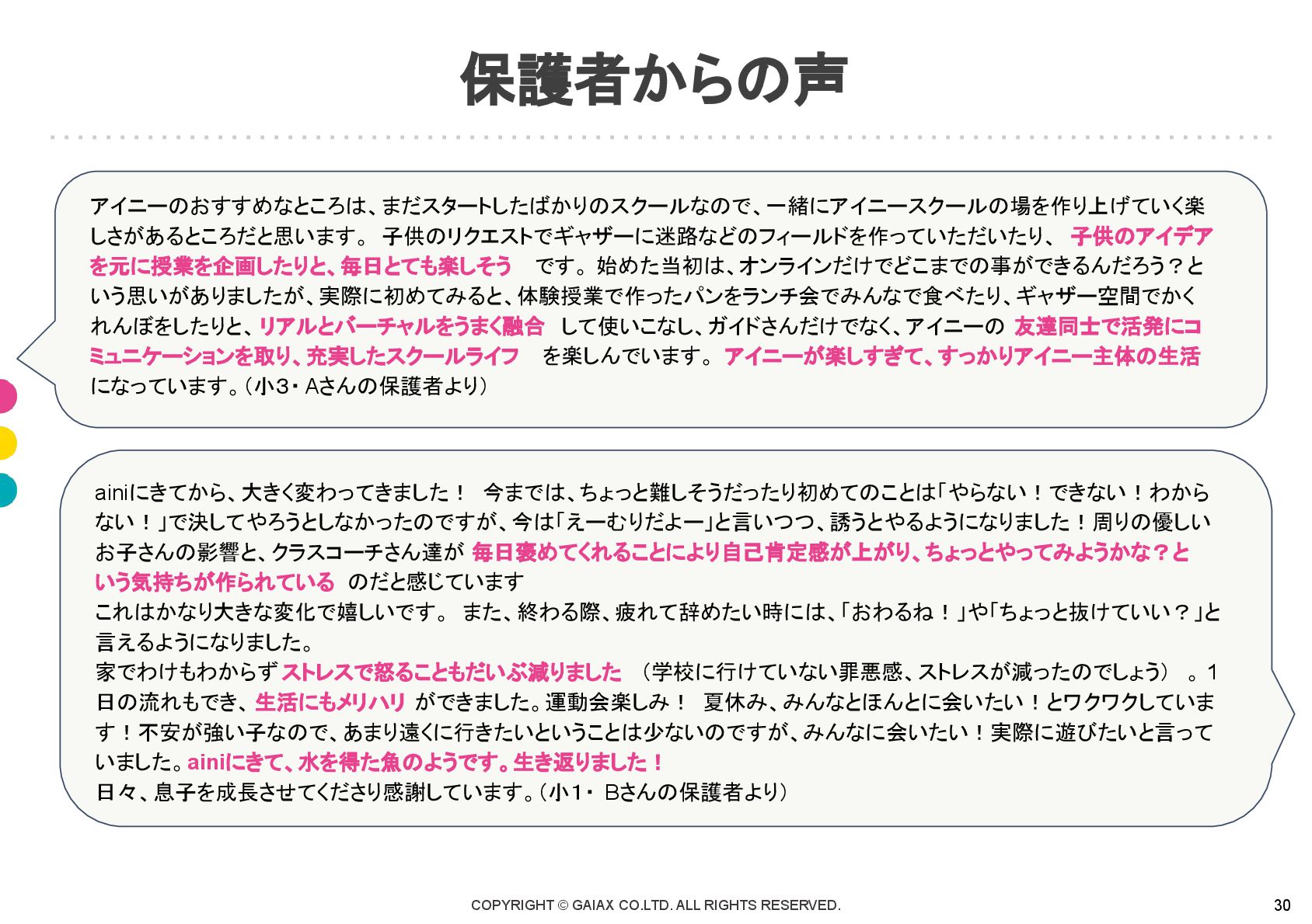 20. COPYRIGHT © GAIAX CO.LTD. ALL RIGHTS RESERVED. 30 保護者からの声 アイニーのおすすめなところは、まだスタートしたばかりのスクールなので、一緒にアイニースクールの場を作り上げていく楽