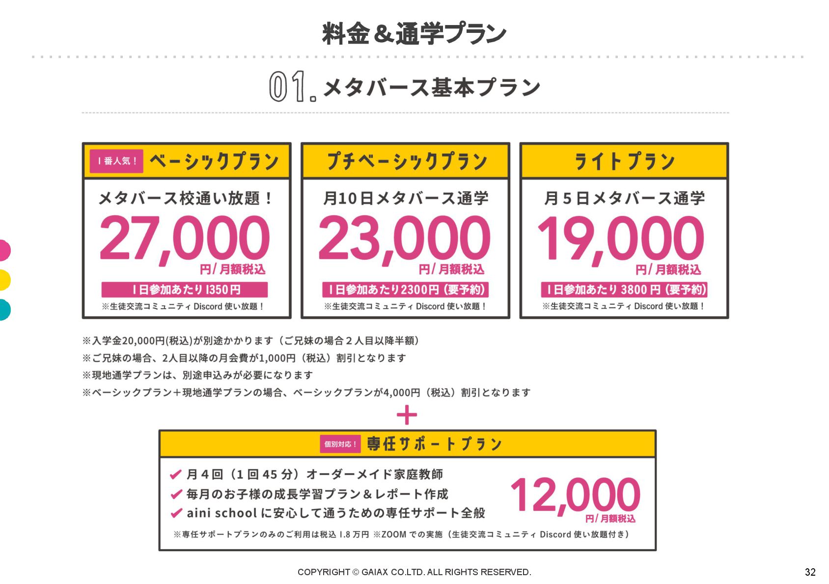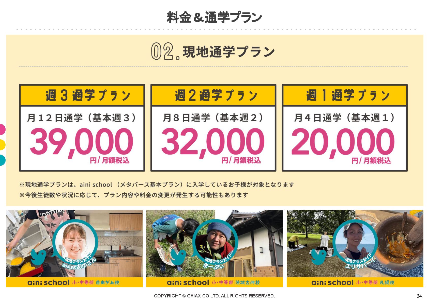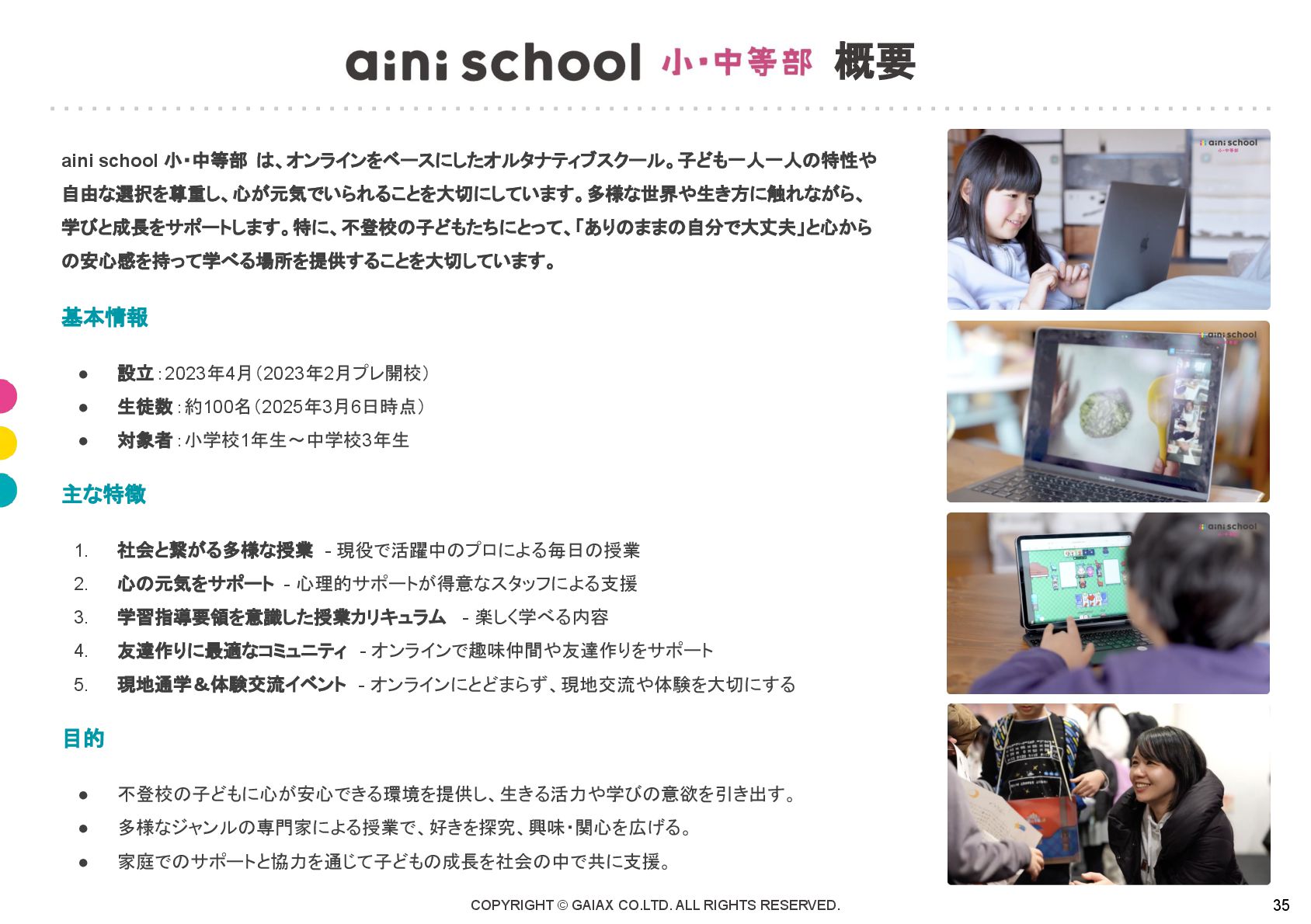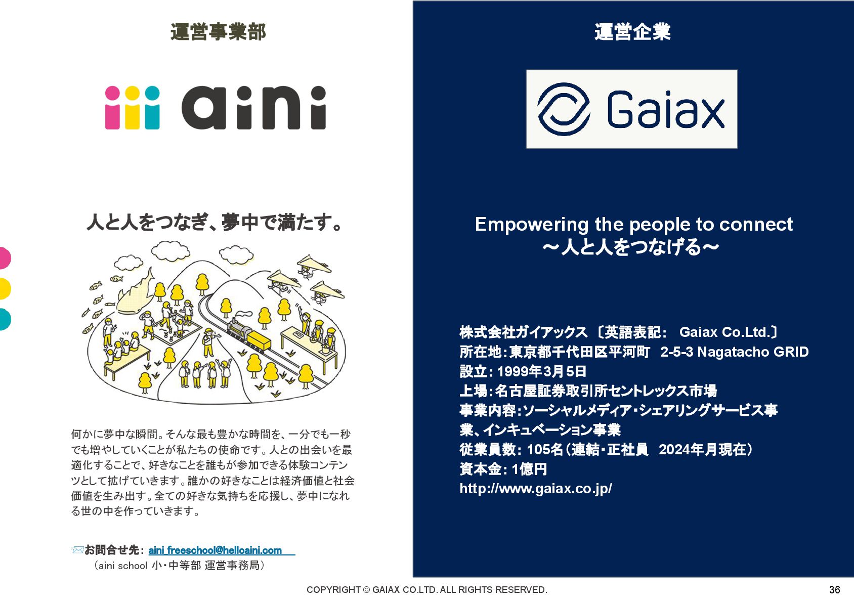 (aini school 小・中等部 運営事務局) 運営企業 運営事業部 株式会社ガイアックス 〔英語表記: Gaiax Co.Ltd.〕 所在地:東京都千代田区平河町 2-5-3 Nagatacho GRID 設立:1999年3月5日 上場:名古屋証券取引所セントレックス市場 事業内容:ソーシャルメディア・シェアリングサービス事 業、インキュベーション事業 従業員数: 105名(連結・正社員 2024年月現在) 資本金: 1億円 http://www.gaiax.co.jp/ Empowering the people to connect 〜人と人をつなげる〜 人と人をつなぎ、夢中で満たす。 何かに夢中な瞬間。そんな最も豊かな時間を、一分でも一秒 でも増やしていくことが私たちの使命です。人との出会いを最 適化することで、好きなことを誰もが参加できる体験コンテン ツとして拡げていきます。誰かの好きなことは経済価値と社会 価値を生み出す。全ての好きな気持ちを応援し、夢中になれ る世の中を作っていきます。 📨お問合せ先: [email protected]