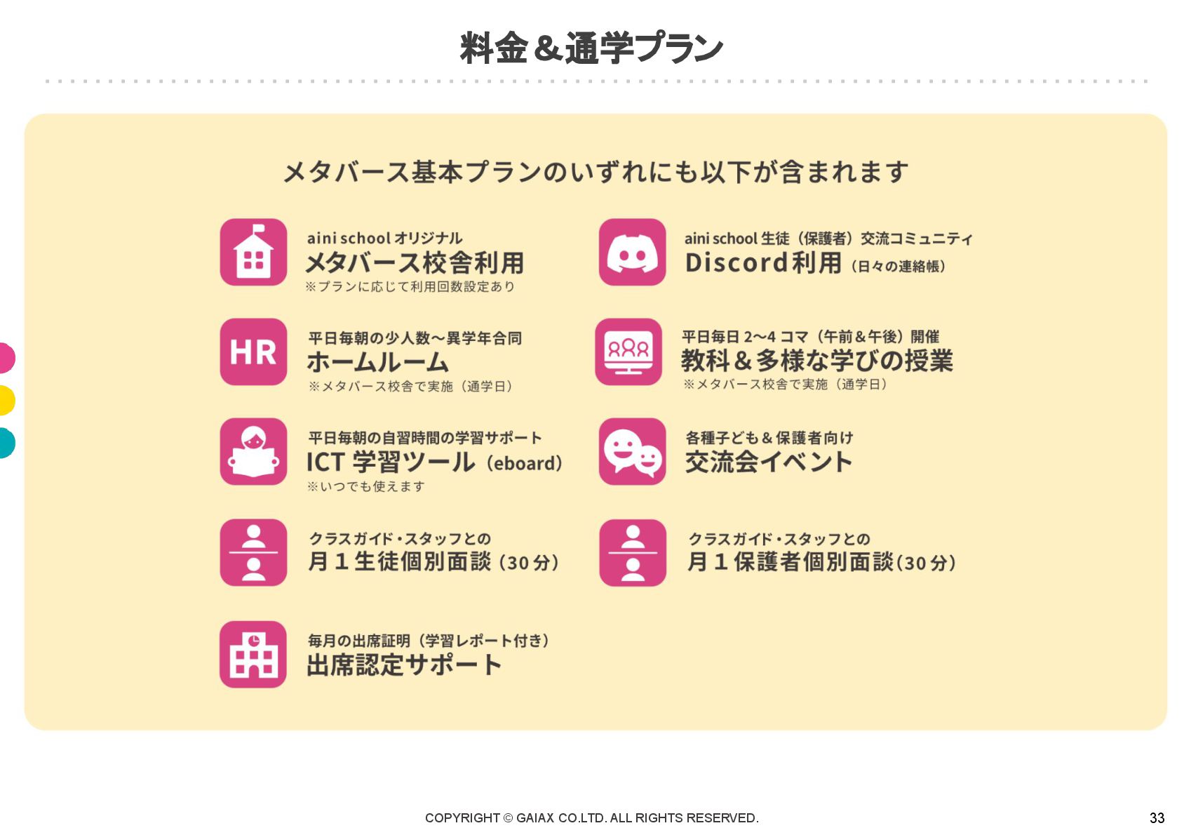 フリー!フラット!オープン!な学校に行かない日のオンラインのオルタナティブスクール(フリースクール)aini school小・中等部説明会資料(最新版)です。