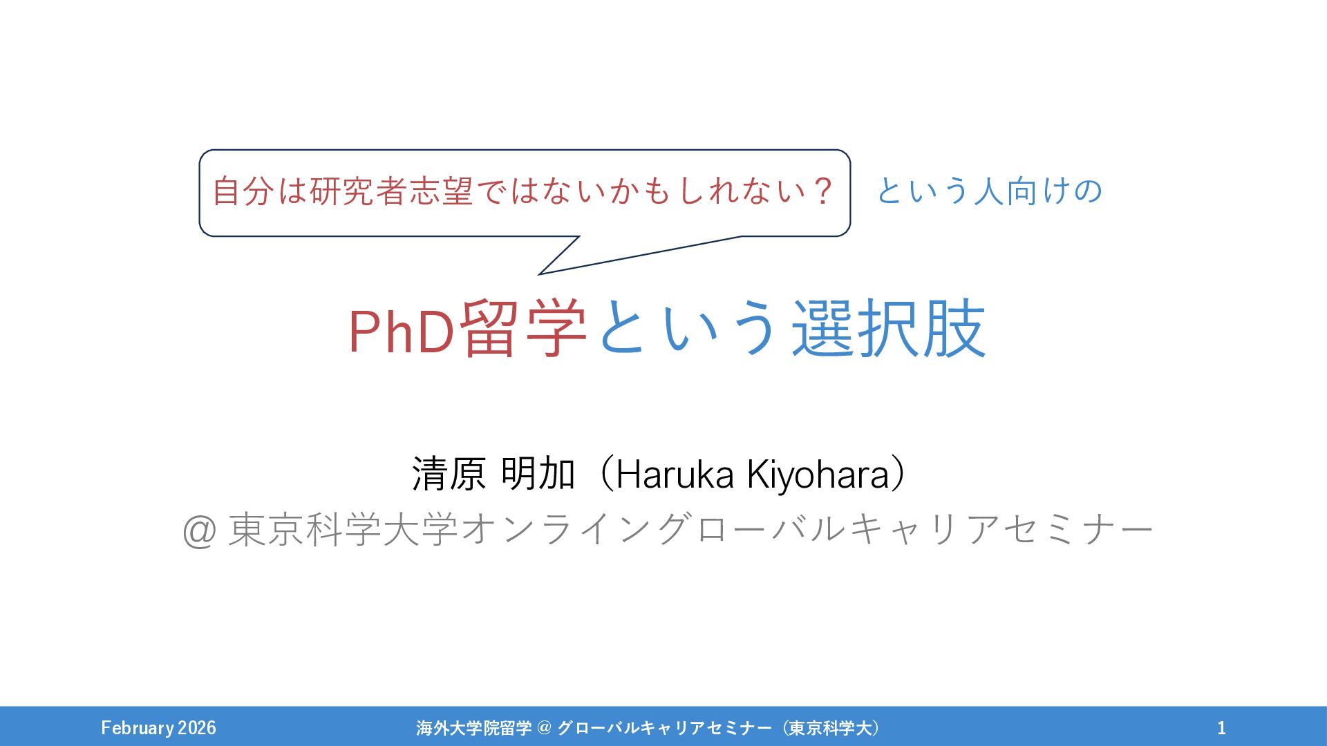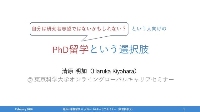 PhD留学という選択肢 清原 明加(Haruka Kiyohara) @ 東京科学大学オンライングローバルキャリアセミナー February 2026 海外大学院留学 @
