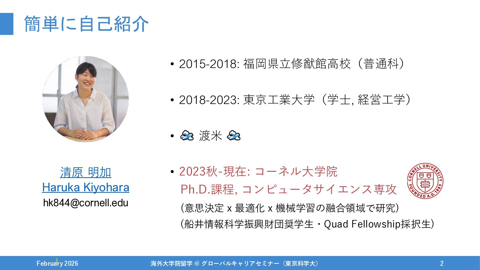 簡単に自己紹介 February 2026 海外大学院留学 @ グローバルキャリアセミナー(東京科学大) 2 • 2015-2018: 福岡県立修猷館高校(普通科)