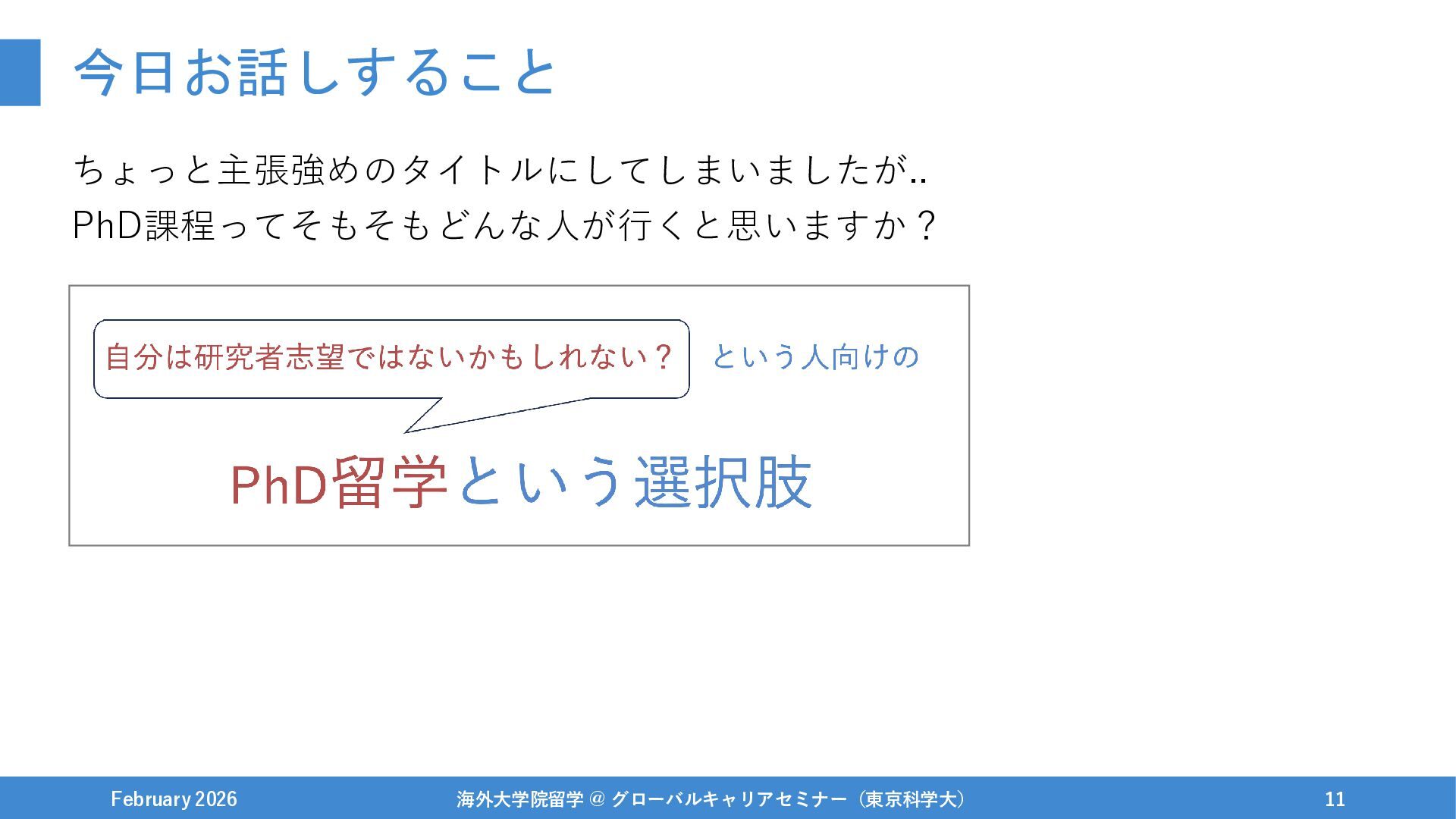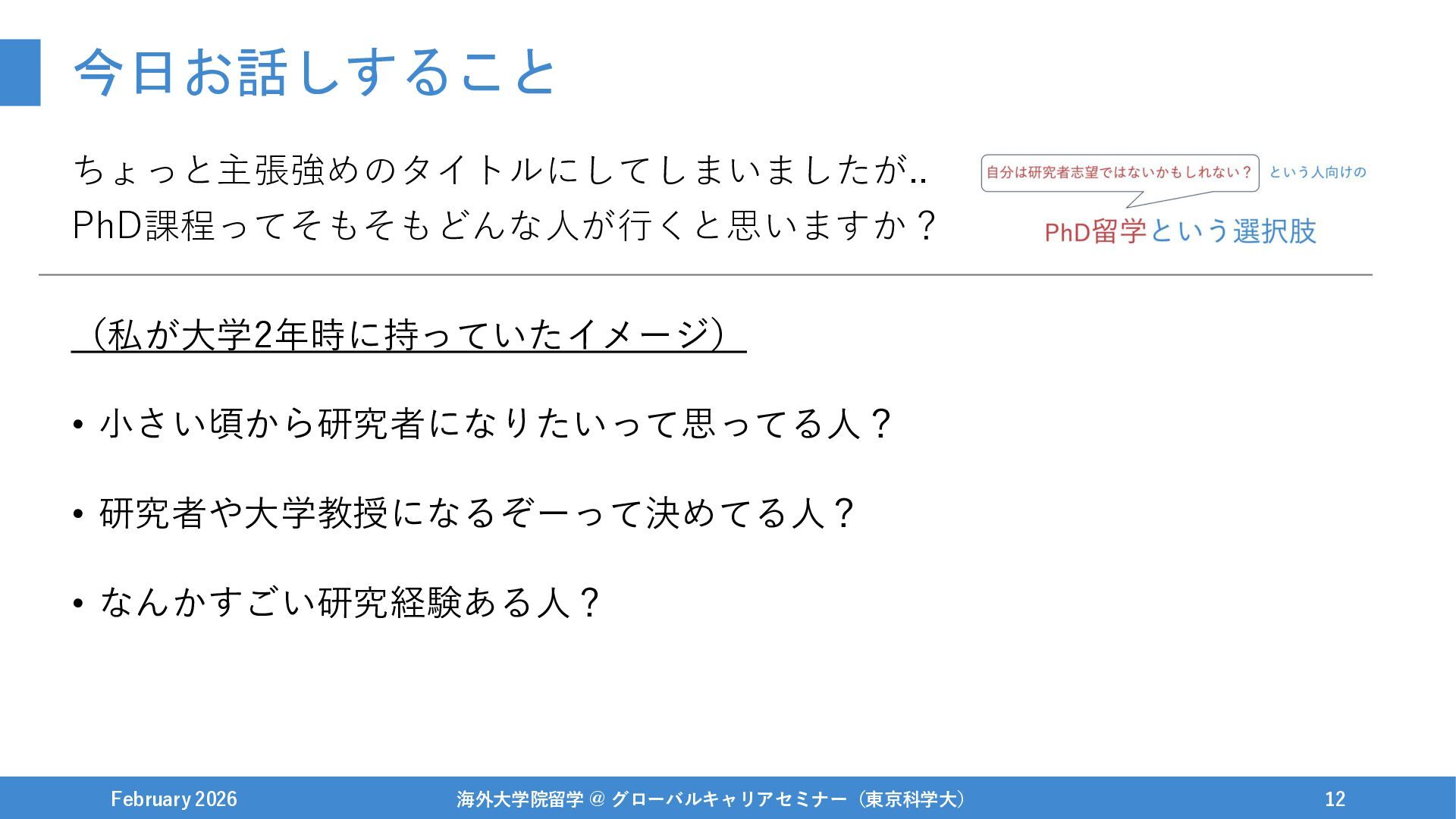 今日お話しすること ちょっと主張強めのタイトルにしてしまいましたが.. PhD課程ってそもそもどんな人が行くと思いますか? February 2026 海外大学院留学 @ グローバルキャリアセミナー(東京科学大) 11