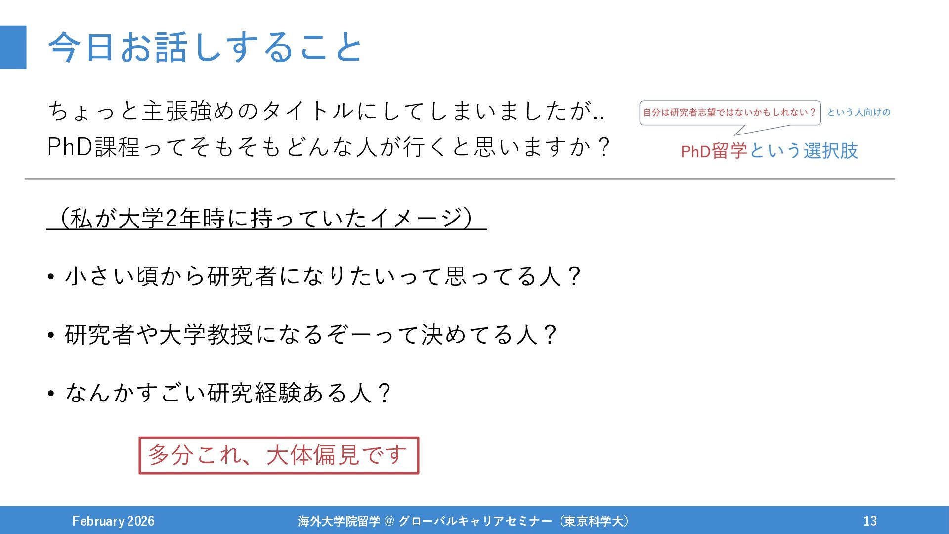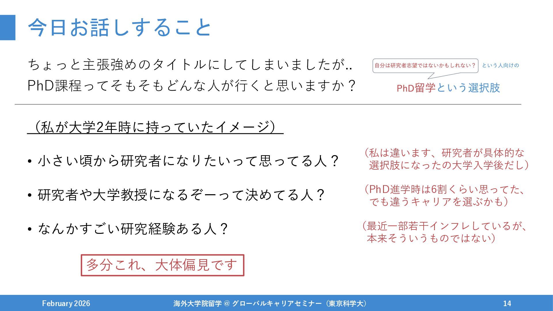 February 2026 海外大学院留学 @ グローバルキャリアセミナー(東京科学大) 14 多分これ、大体偏見です (私は違います、研究者が具体的な 選択肢になったの大学入学後だし) (PhD進学時は6割くらい思ってた、 でも違うキャリアを選ぶかも) (最近一部若干インフレしているが、 本来そういうものではない)