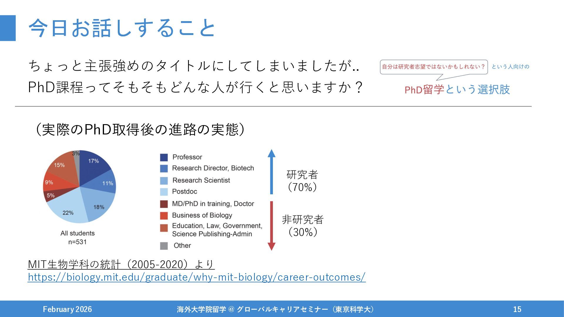 今日お話しすること ちょっと主張強めのタイトルにしてしまいましたが.. PhD課程ってそもそもどんな人が行くと思いますか? (実際のPhD取得後の進路の実態) February 2026 海外大学院留学 @ グローバルキャリアセミナー(東京科学大) 15