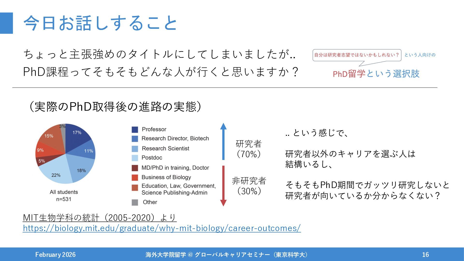 今日お話しすること ちょっと主張強めのタイトルにしてしまいましたが.. PhD課程ってそもそもどんな人が行くと思いますか? (実際のPhD取得後の進路の実態) February 2026 海外大学院留学 @ グローバルキャリアセミナー(東京科学大) 16