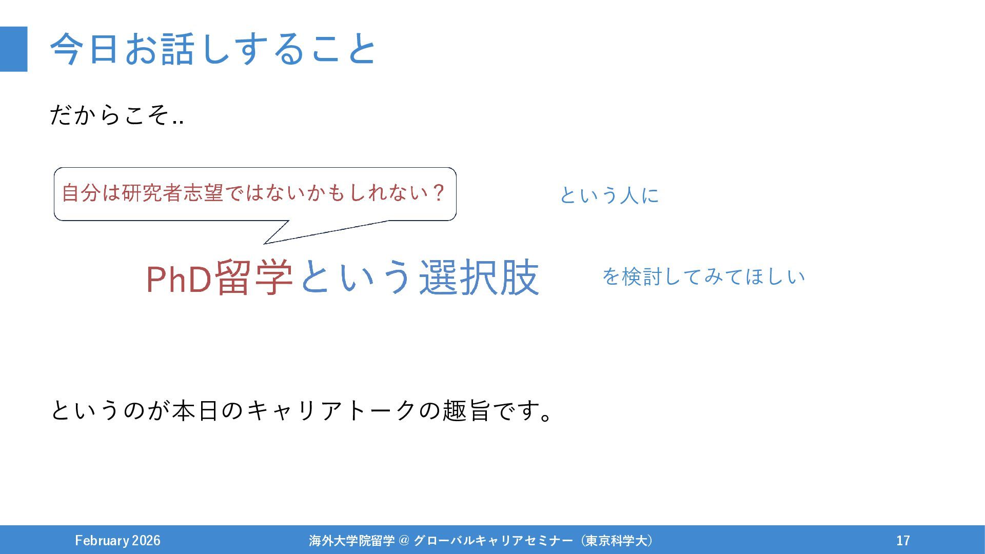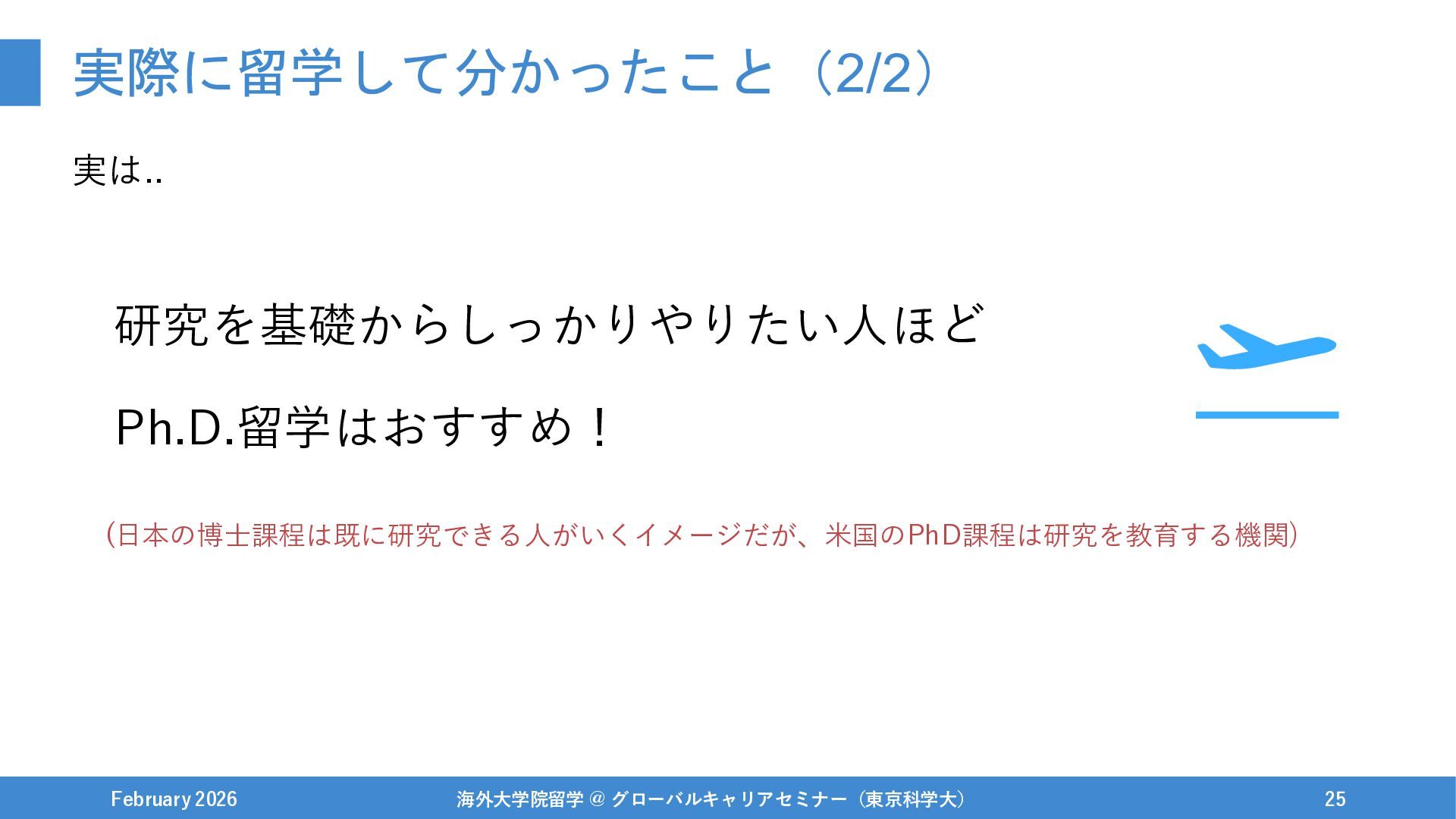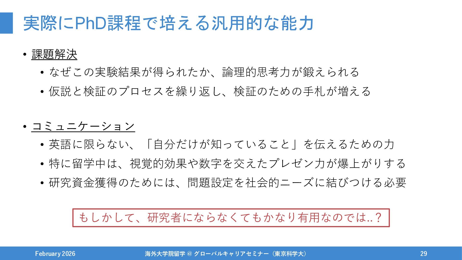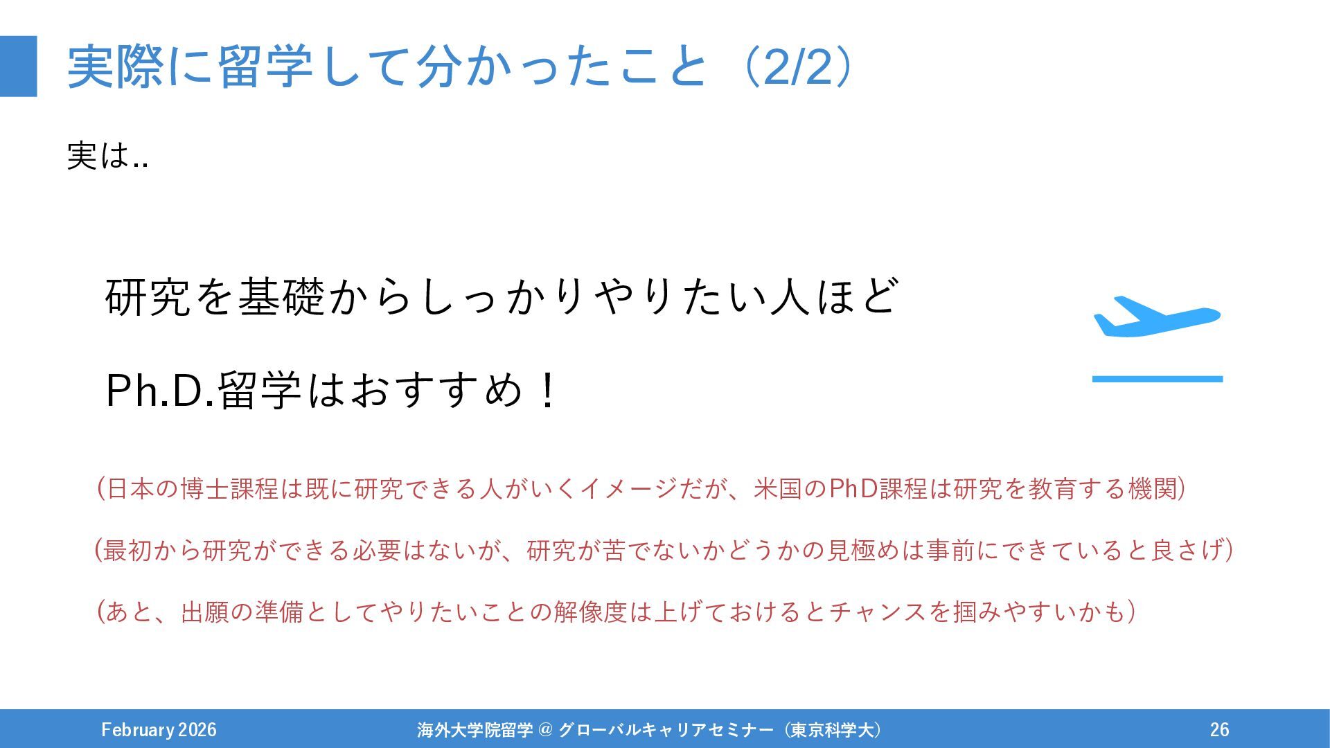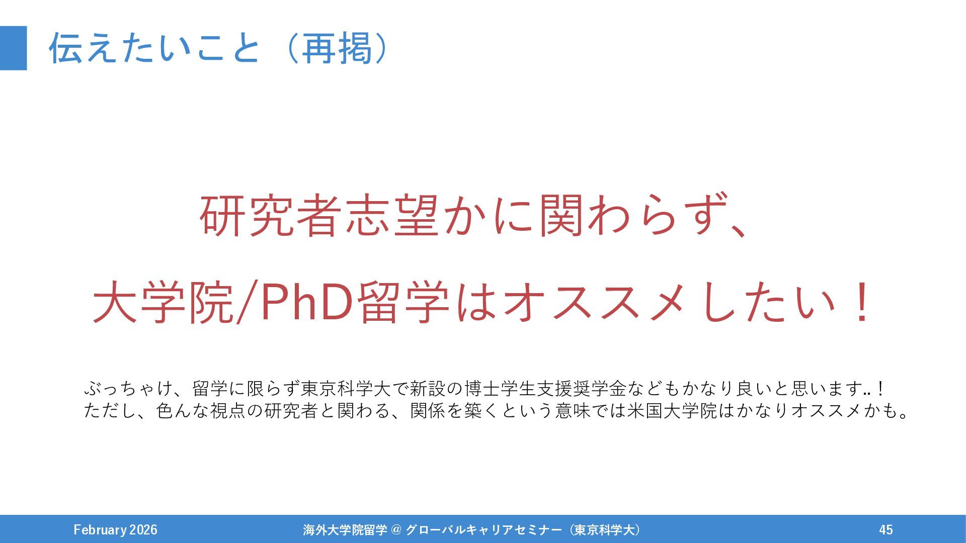 伝えたいこと(再掲) February 2026 海外大学院留学 @ グローバルキャリアセミナー(東京科学大) 45 研究者志望かに関わらず、 大学院/PhD留学はオススメしたい! ぶっちゃけ、留学に限らず東京科学大で新設の博士学生支援奨学金などもかなり良いと思います..!