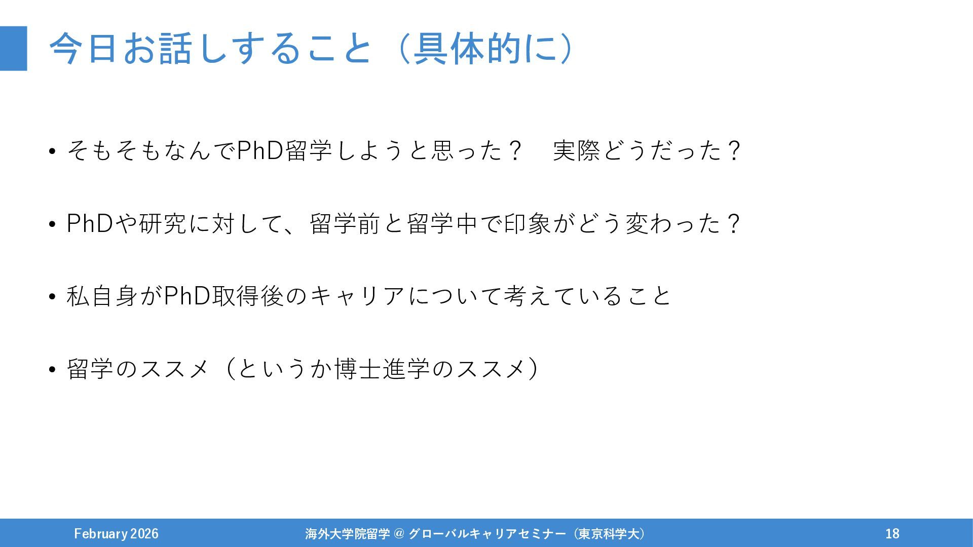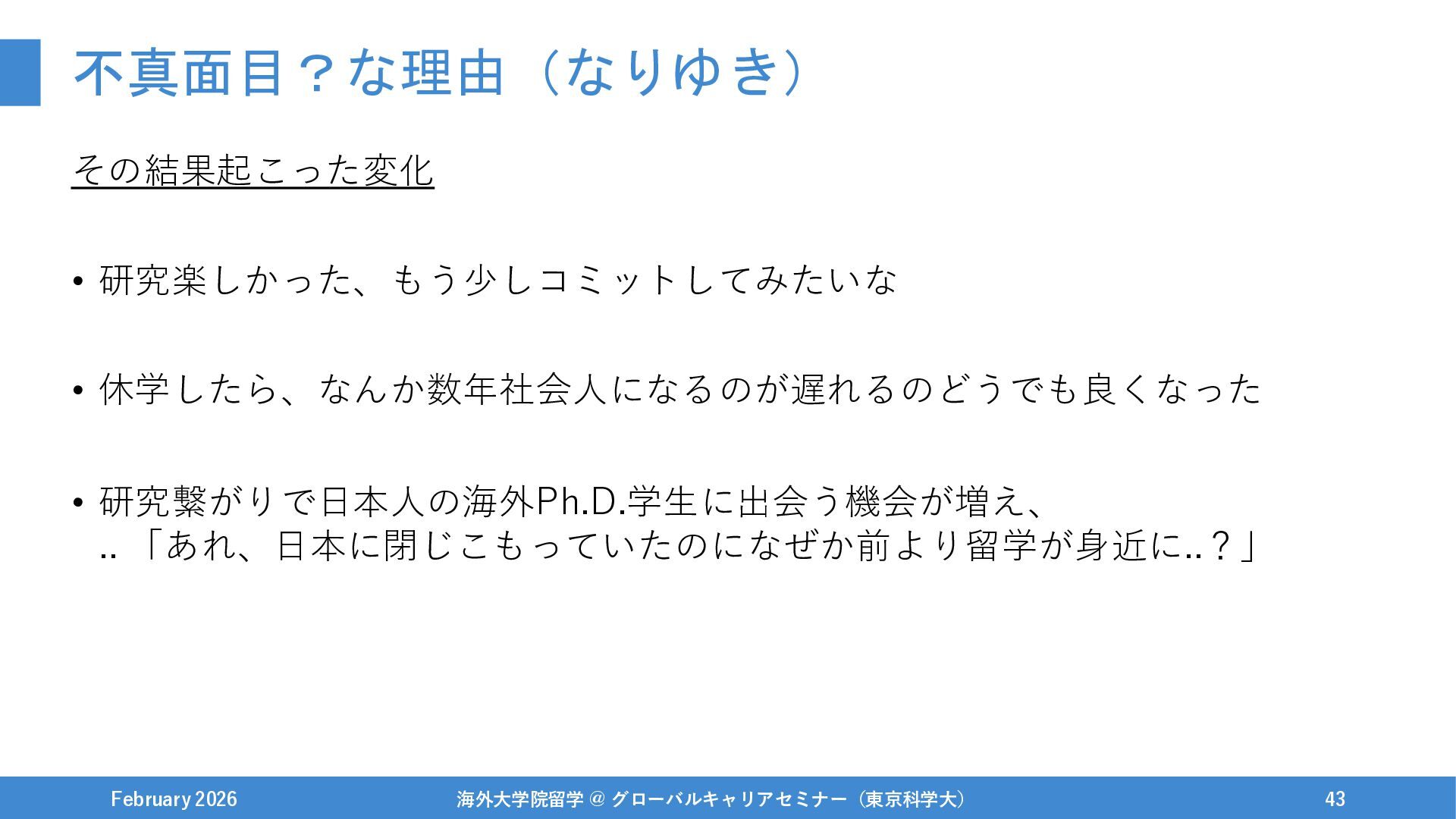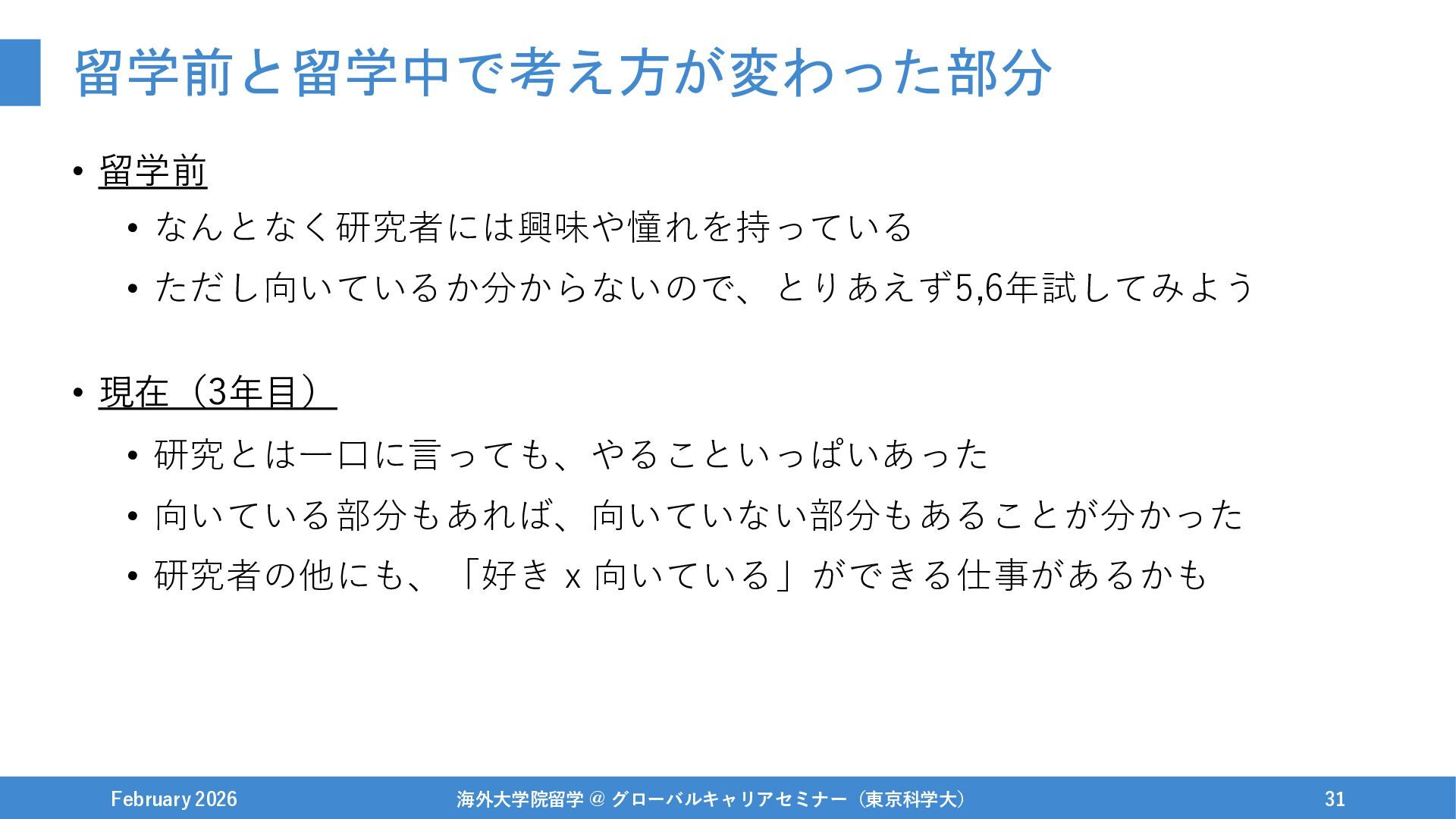 1年休学をする / 興味あった研究インターンを開始 February 2026 海外大学院留学 @ グローバルキャリアセミナー(東京科学大) 42