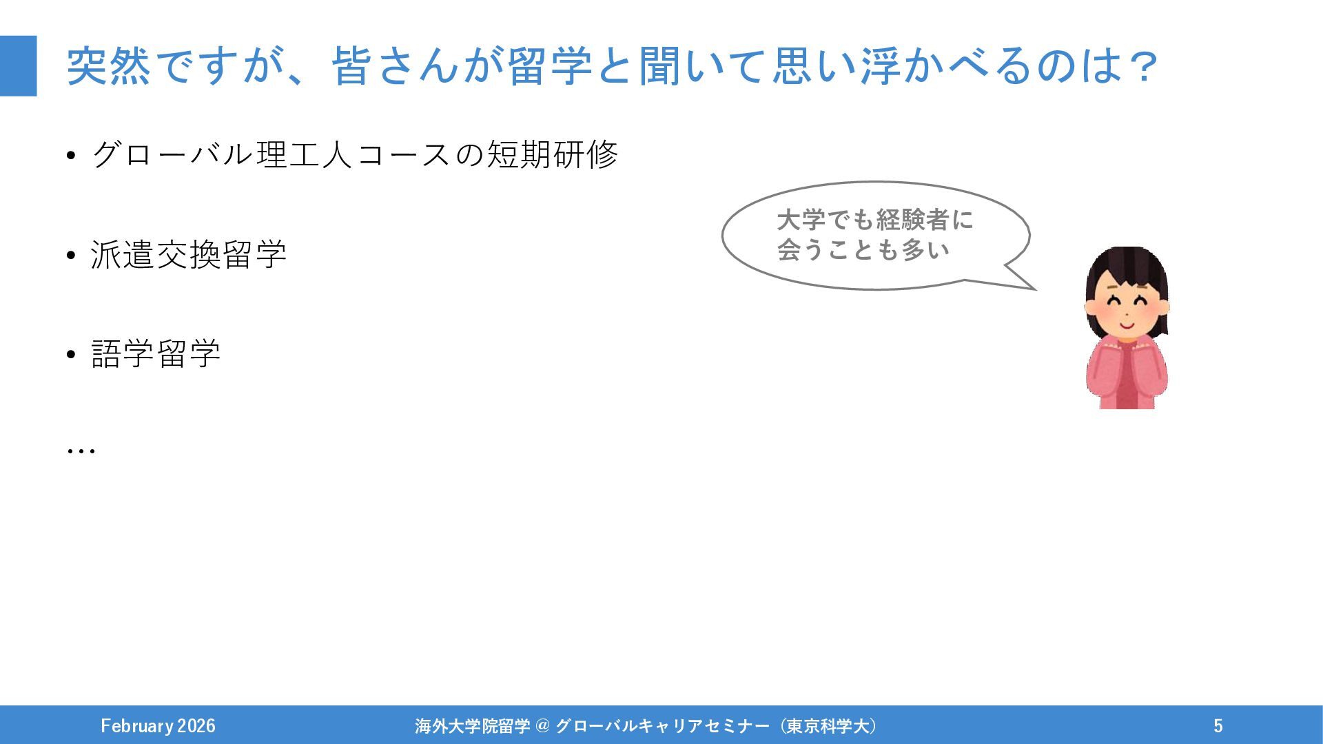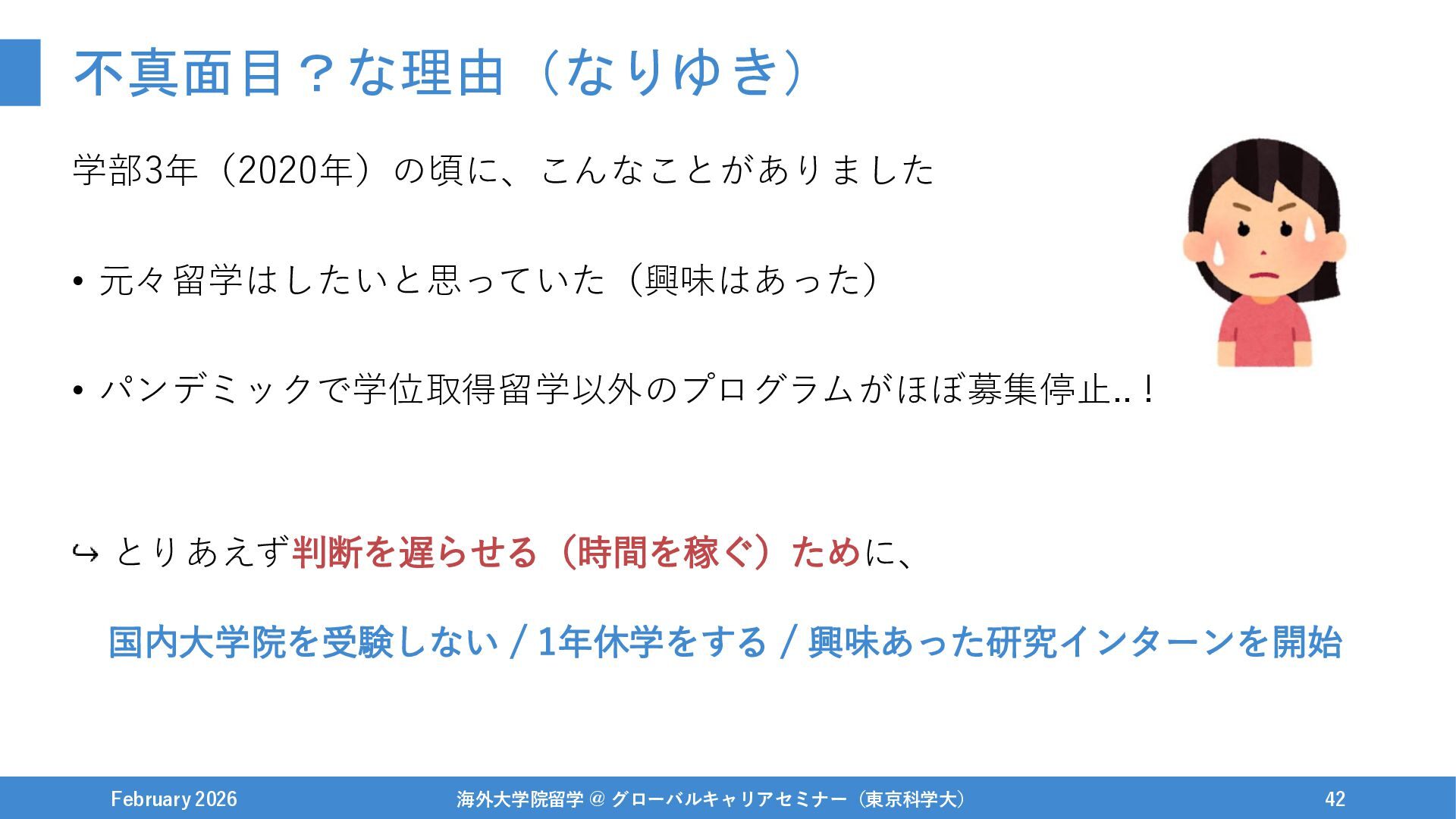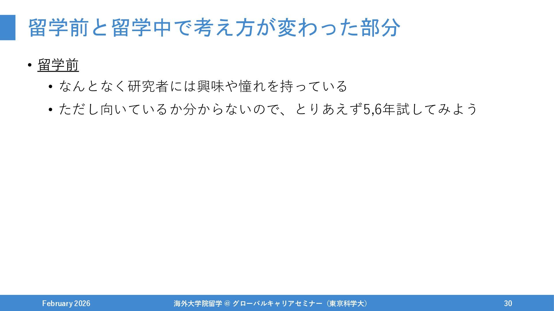 1年休学をする / 興味あった研究インターンを開始 February 2026 海外大学院留学 @ グローバルキャリアセミナー(東京科学大) 42