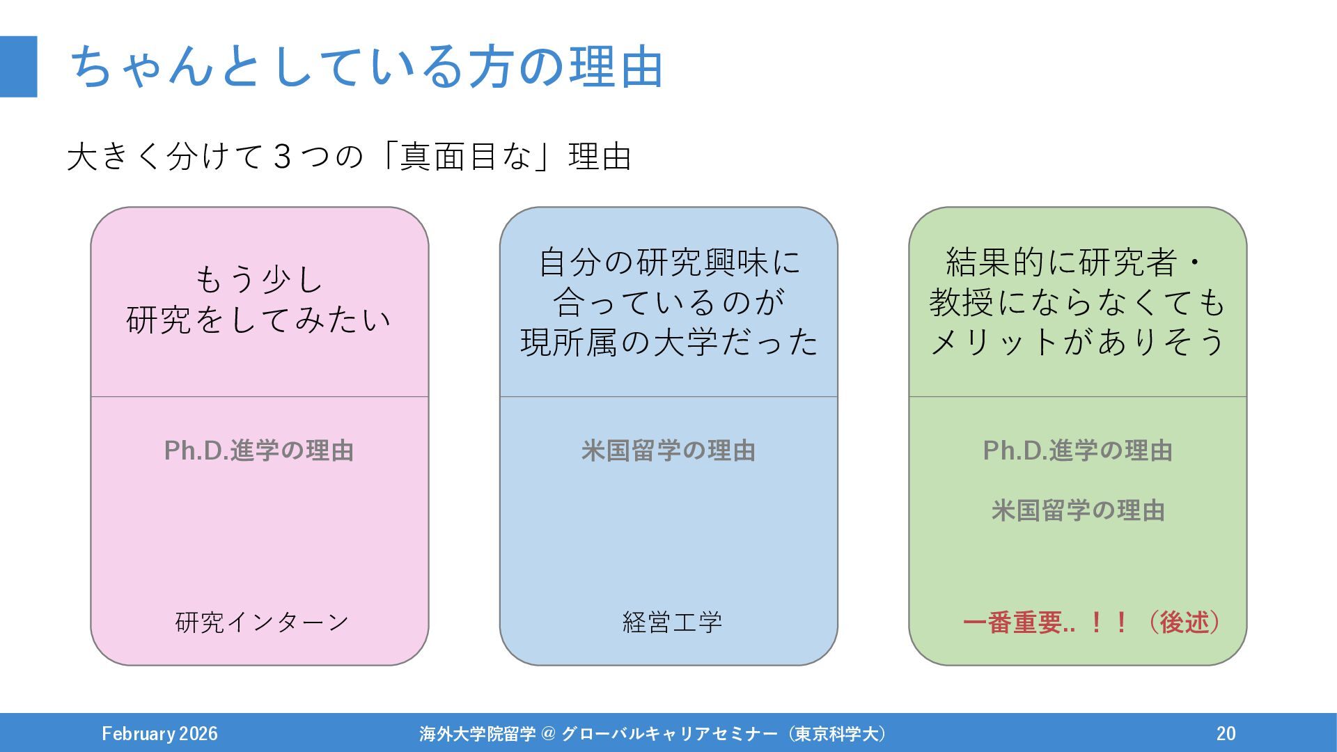 ちゃんとしている方の理由 大きく分けて3つの「真面目な」理由 February 2026 海外大学院留学 @ グローバルキャリアセミナー(東京科学大) 20 Ph.D.進学の理由 Ph.D.進学の理由
