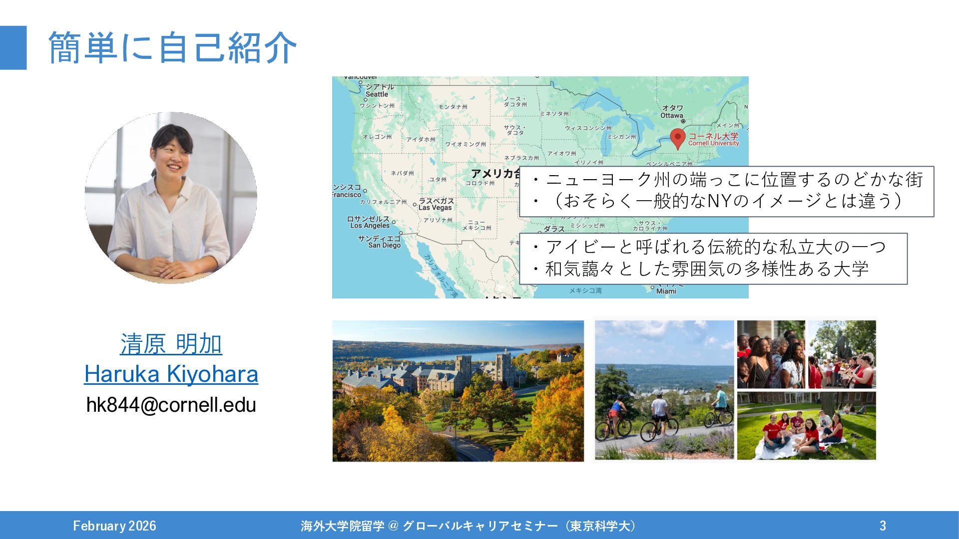 簡単に自己紹介 February 2026 海外大学院留学 @ グローバルキャリアセミナー(東京科学大) 3 ・ニューヨーク州の端っこに位置するのどかな街 ・(おそらく一般的なNYのイメージとは違う) ・アイビーと呼ばれる伝統的な私立大の一つ