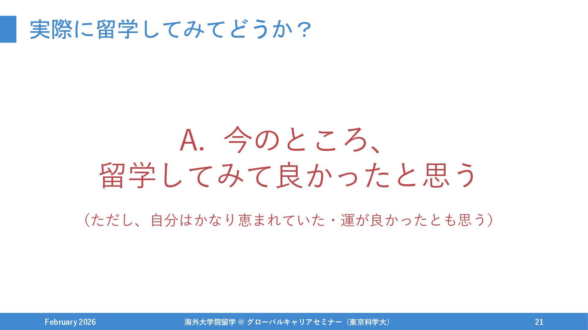 どうして留学しようと思ったのか? February 2026 海外大学院留学 @ グローバルキャリアセミナー(東京科学大) 19 A. ぶっちゃけると 半分真面目な理由、半分なりゆき