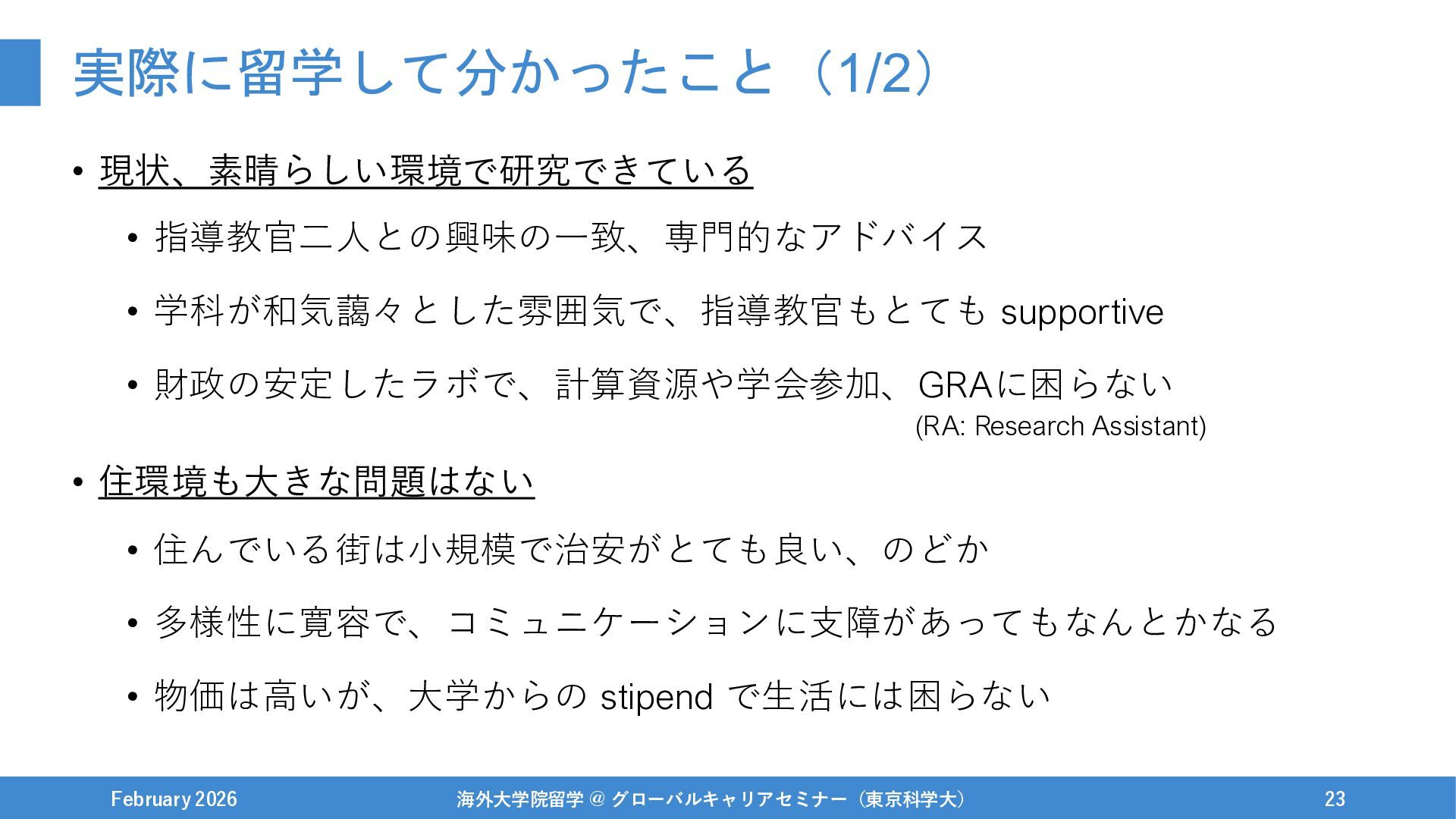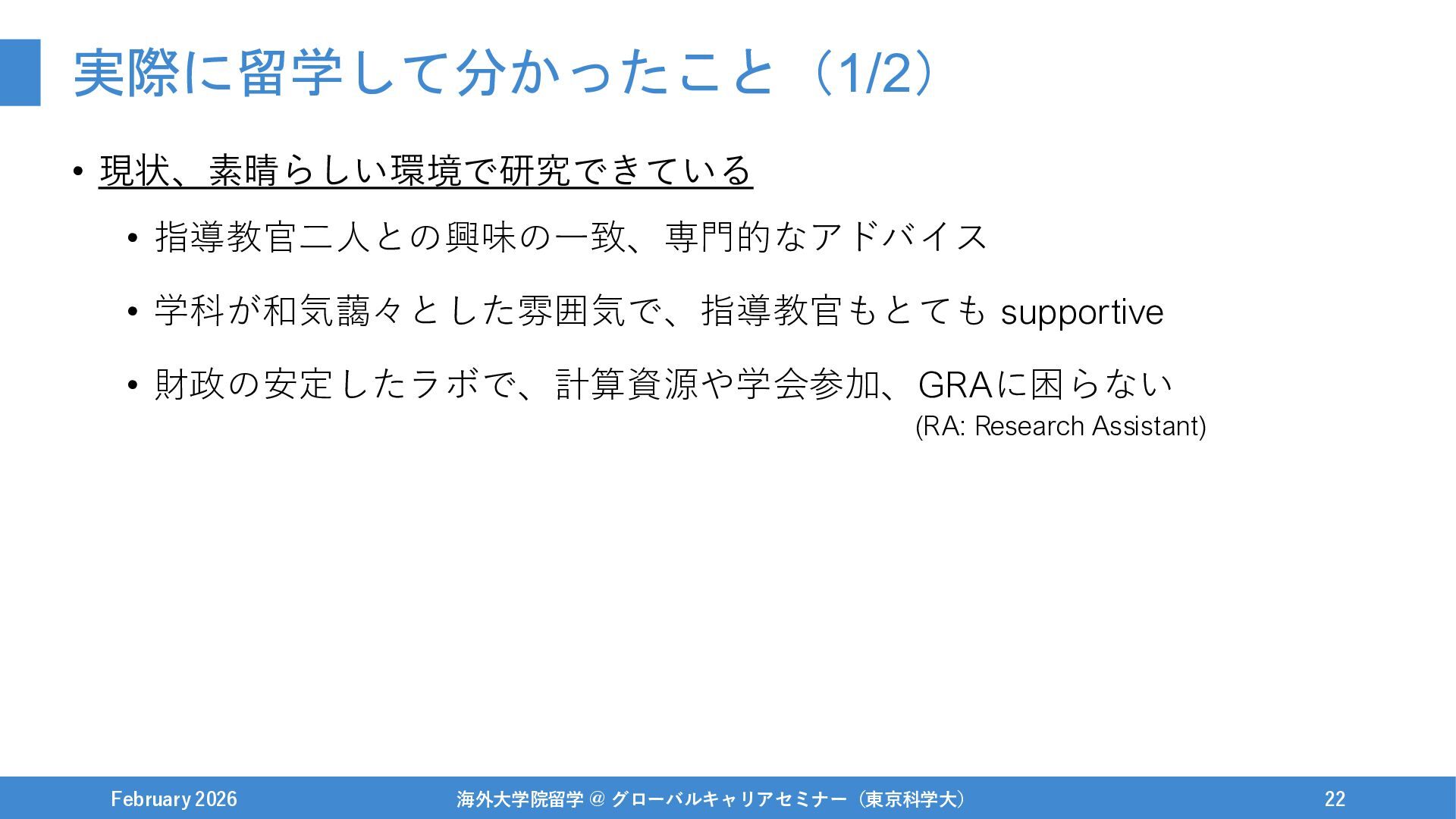 February 2026 海外大学院留学 @ グローバルキャリアセミナー(東京科学大) 22 (RA: Research Assistant)