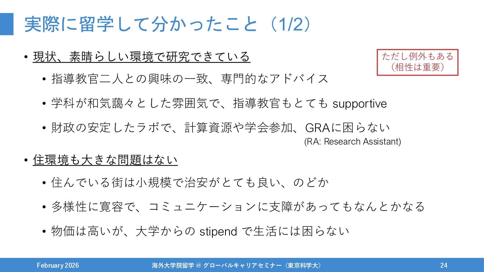 • 住環境も大きな問題はない • 住んでいる街は小規模で治安がとても良い、のどか • 多様性に寛容で、コミュニケーションに支障があってもなんとかなる • 物価は高いが、大学からの stipend で生活には困らない February 2026 海外大学院留学 @ グローバルキャリアセミナー(東京科学大) 23 (RA: Research Assistant)