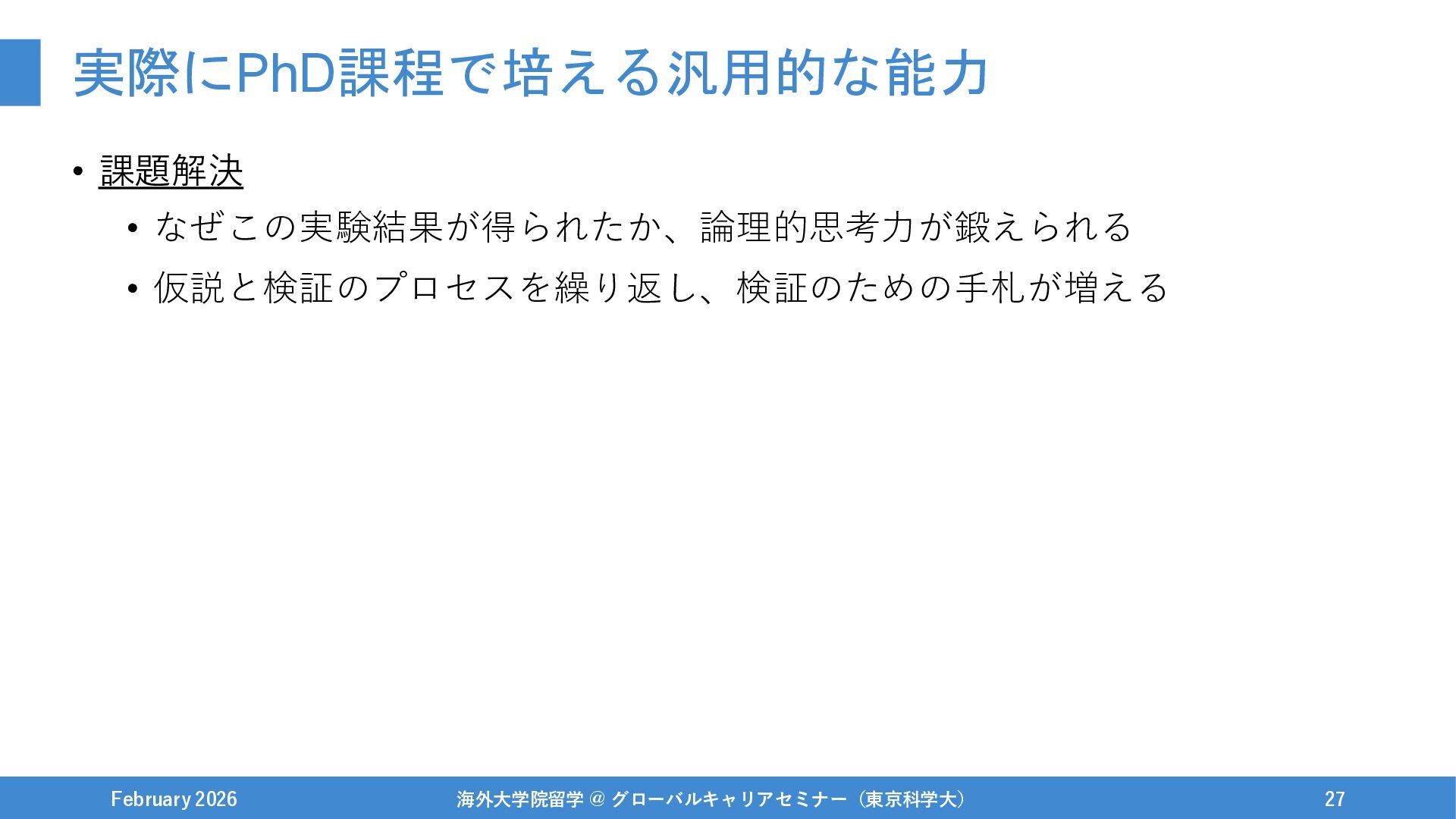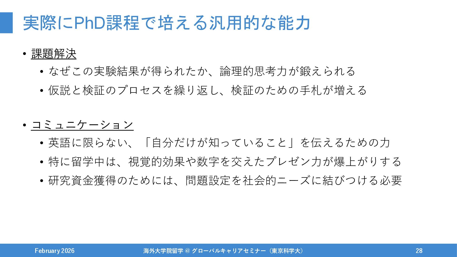 実際にPhD課程で培える汎用的な能力 • 課題解決 • なぜこの実験結果が得られたか、論理的思考力が鍛えられる • 仮説と検証のプロセスを繰り返し、検証のための手札が増える February 2026 海外大学院留学