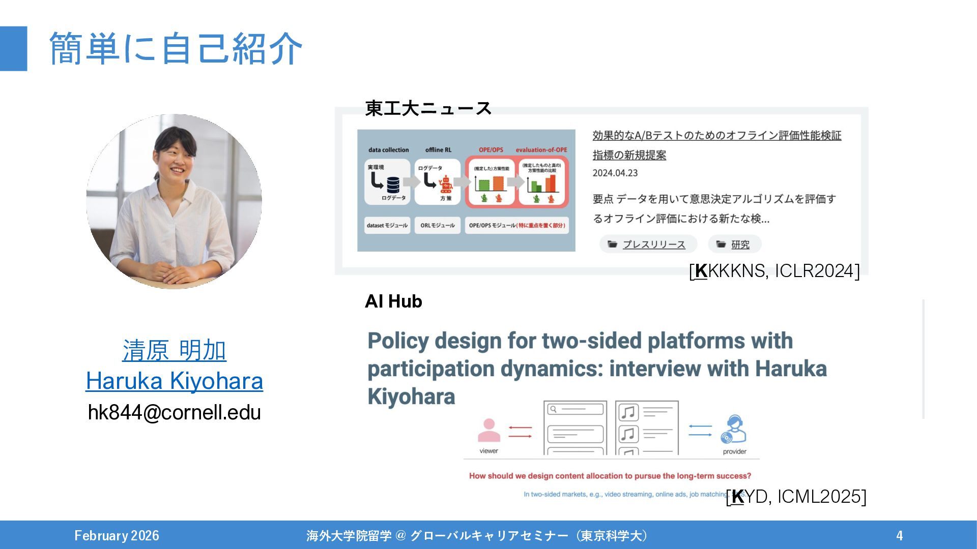 簡単に自己紹介 February 2026 海外大学院留学 @ グローバルキャリアセミナー(東京科学大) 4 東工大ニュース [KKKKNS, ICLR2024]