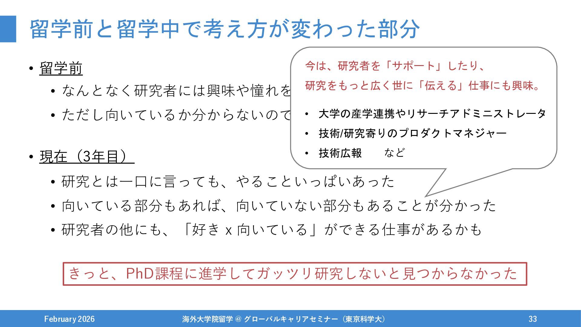 研究とは一口に言っても、やることいっぱいあった • 向いている部分もあれば、向いていない部分もあることが分かった • 研究者の他にも、「好き x 向いている」ができる仕事があるかも February 2026 海外大学院留学 @ グローバルキャリアセミナー(東京科学大) 32 今は、研究者を「サポート」したり、 研究をもっと広く世に「伝える」仕事にも興味。 • 大学の産学連携やリサーチアドミニストレータ • 技術/研究寄りのプロダクトマネジャー • 技術広報 など