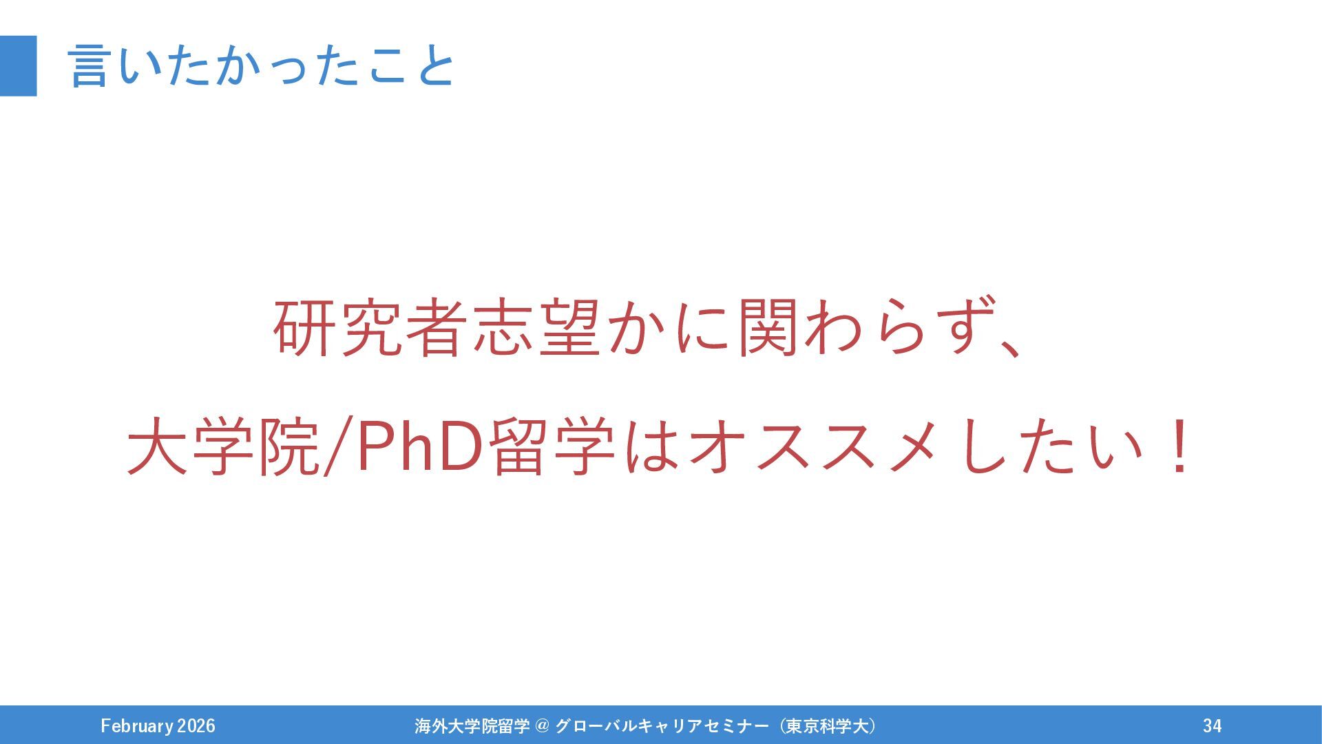 言いたかったこと February 2026 海外大学院留学 @ グローバルキャリアセミナー(東京科学大) 34 研究者志望かに関わらず、 大学院/PhD留学はオススメしたい!