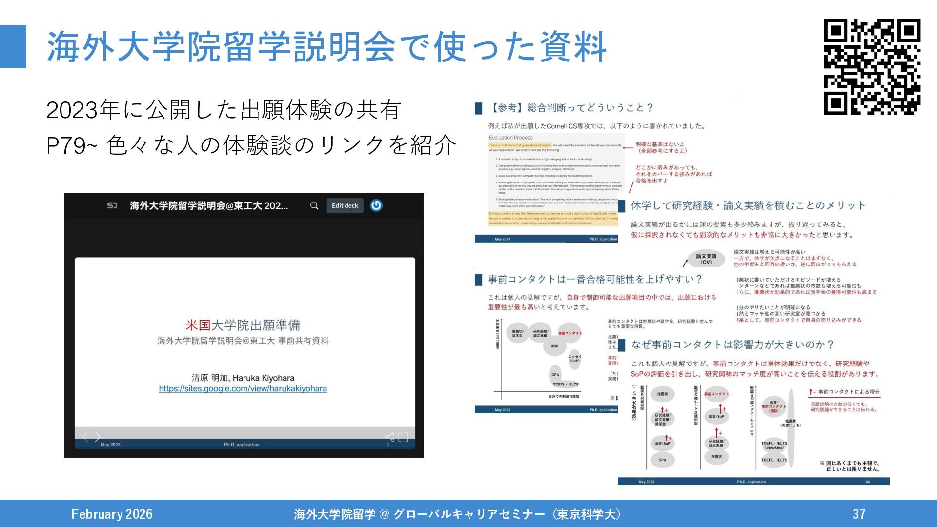 海外大学院留学説明会で使った資料 2023年に公開した出願体験の共有 P79~ 色々な人の体験談のリンクを紹介 February 2026 海外大学院留学 @ グローバルキャリアセミナー(東京科学大) 37