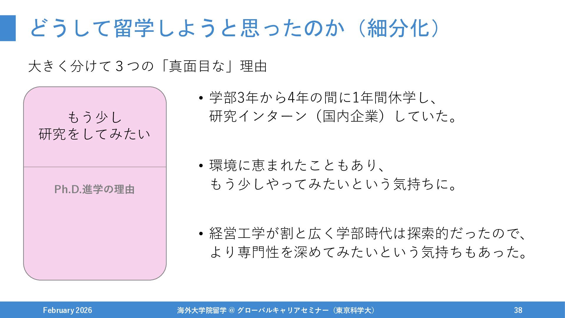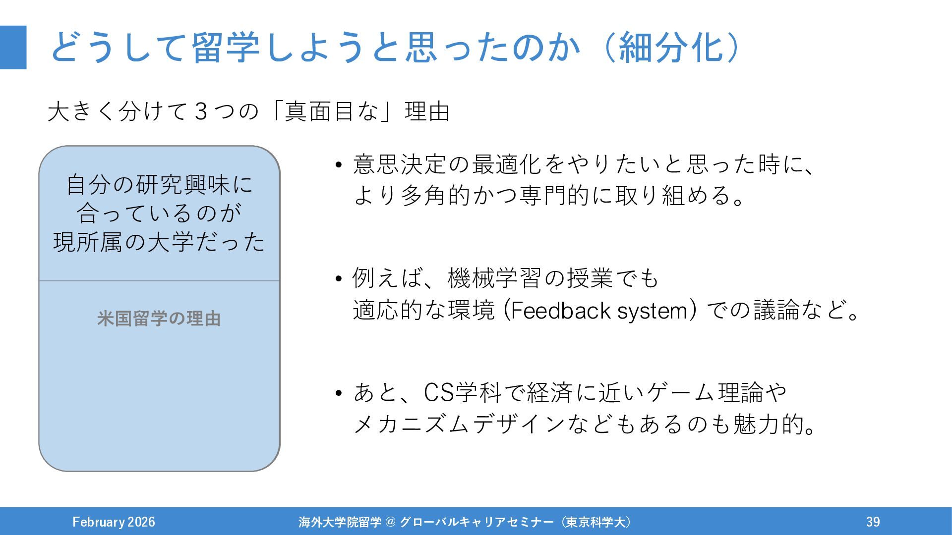 どうして留学しようと思ったのか(細分化) 大きく分けて3つの「真面目な」理由 February 2026 海外大学院留学 @ グローバルキャリアセミナー(東京科学大) 38 Ph.D.進学の理由 もう少し