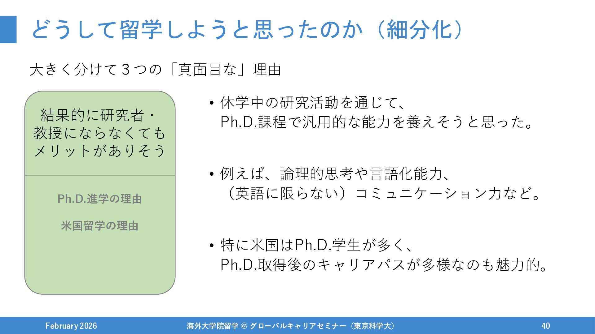 どうして留学しようと思ったのか(細分化) 大きく分けて3つの「真面目な」理由 February 2026 海外大学院留学 @ グローバルキャリアセミナー(東京科学大) 39 Ph.D.進学の理由 もう少し
