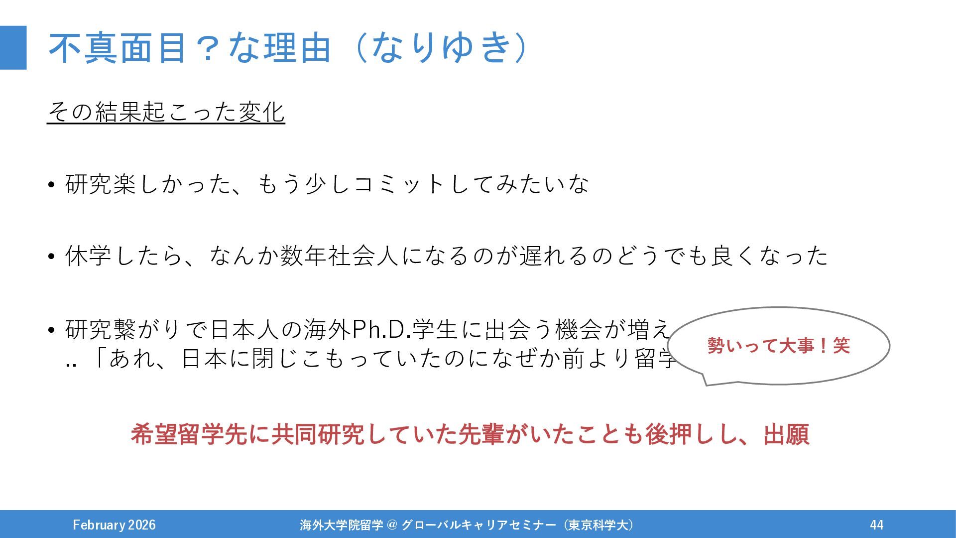 February 2026 海外大学院留学 @ グローバルキャリアセミナー(東京科学大) 44 希望留学先に共同研究していた先輩がいたことも後押しし、出願 勢いって大事!笑