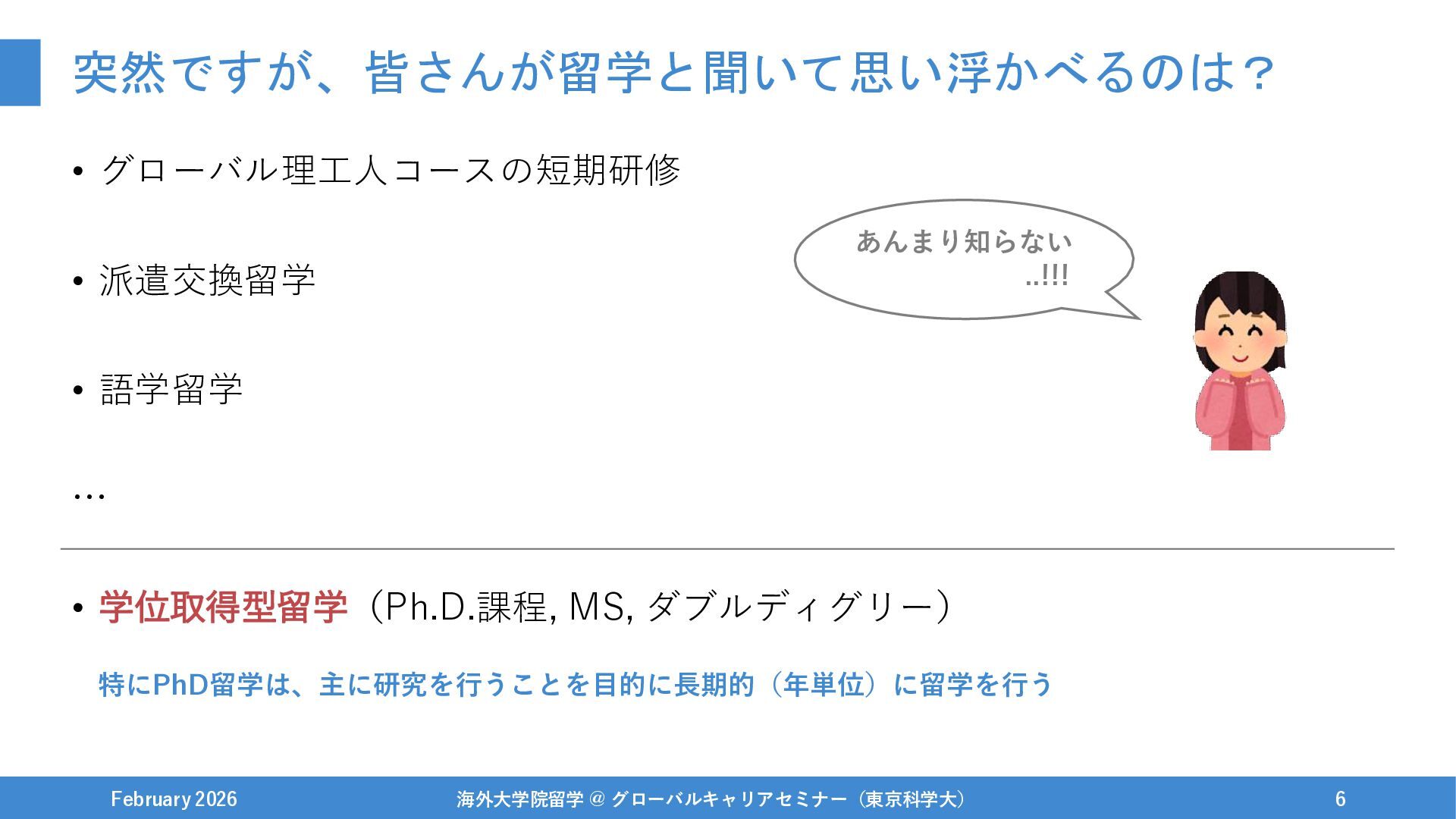 MS, ダブルディグリー) February 2026 海外大学院留学 @ グローバルキャリアセミナー(東京科学大) 6 特にPhD留学は、主に研究を行うことを目的に長期的(年単位)に留学を行う あんまり知らない ..!!!