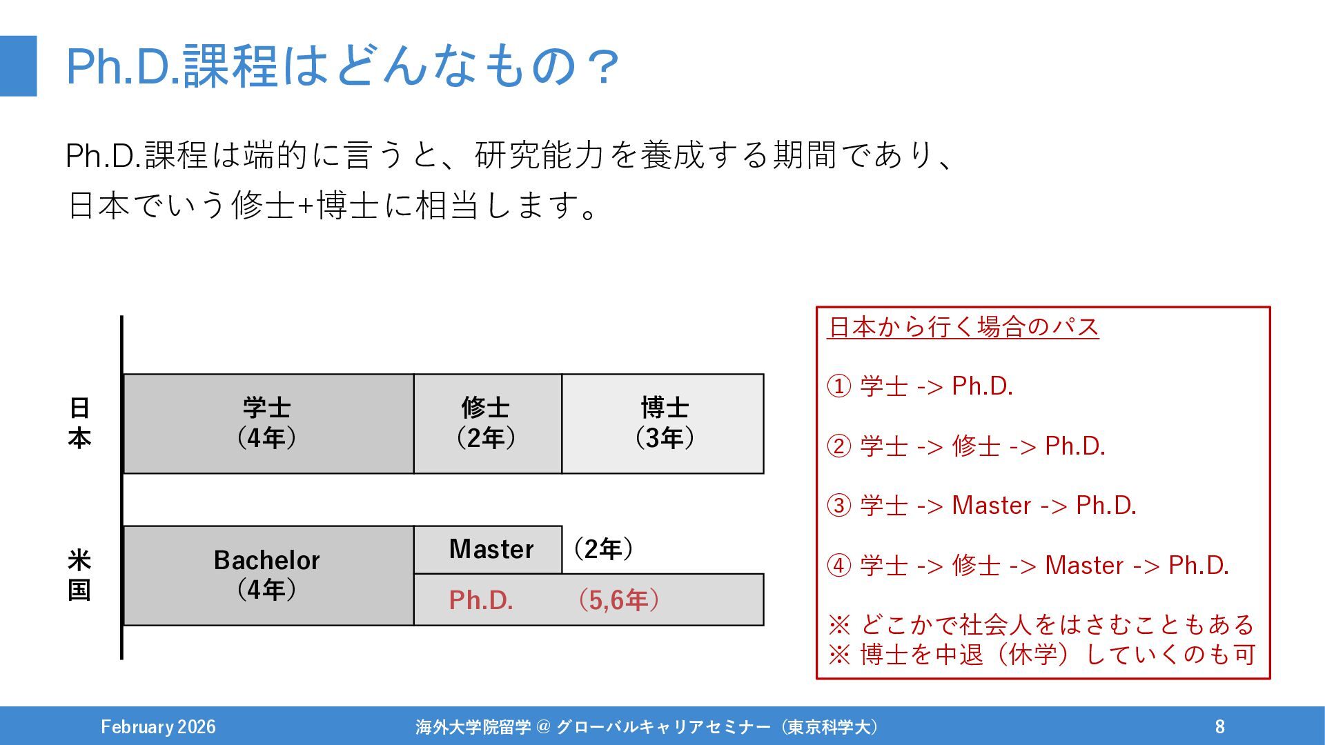 Ph.D.課程はどんなもの? Ph.D.課程は端的に言うと、研究能力を養成する期間であり、 日本でいう修士+博士に相当します。 February 2026 海外大学院留学 @ グローバルキャリアセミナー(東京科学大) 7 学士